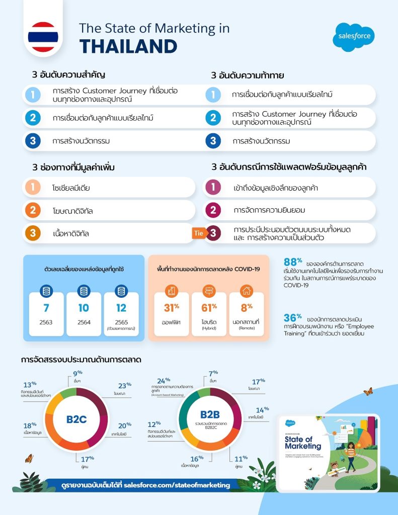รายงาน State of Marketing Reportในส่วนข้อมูลของประเทศไทยเผยให้เห็นว่า นักการตลาดไทยกว่า 75% คาดการณ์ถึงรายได้ที่เพิ่มขึ้นขององค์กรในอีก 12 ถึง 18 เดือนข้างหน้า ในขณะที่ 84% ของนักการตลาดไทยรู้สึกว่าผลงานการตลาดที่พวกเขาสร้างขึ้นดูจะมีคุณค่าและเป็นผลมากกว่าปีที่ผ่านมา อย่างไรก็ตามนักการตลาดยังคงเผชิญความท้าทายโดย 71% ของนักการตลาดไทยเห็นพ้องกันว่า การตอบสนองให้ตรงต่อความคาดหวังของผู้บริโภคนั้นยากขึ้นกว่าปีที่ผ่านมา