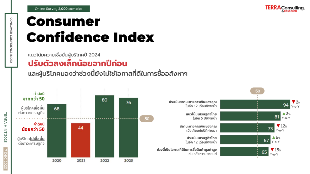 ทางด้านแนวโน้มความเชื่อมั่นผู้บริโภคในปี 2567 พบว่า ค่าดัชนีอยู่ที่ 76% ลดลง 4% เมื่อเทียบจากปีก่อนที่ 80% แม้ในภาพรวมค่าดัชนีจะลดลงเล็กน้อยจากปีก่อน แต่ในแง่ของการซื้อสินค้ามูลค่าสูง เช่น อสังหาฯ, รถยนต์ ผู้บริโภคส่วนใหญ่ยังคงมองว่าช่วงนี้ไม่ใช่โอกาสดีในการซื้ออสังหาฯ ทั้งจากภาพรวมเศรษฐกิจที่ยังชะลอตัว อัตราดอกเบี้ยที่ปรับตัวสูงขึ้น ความเข้มงวดของสถาบันการเงิน รวมถึงราคาอสังหาฯที่ปรับตัวสูงขึ้นตามค่าก่อสร้างใหม่ ซึ่งมีผลต่อการขอสินเชื่อใหม่ทำให้ลูกค้าบางกลุ่มต้องชะลอการตัดสินใจซื้อออกไป