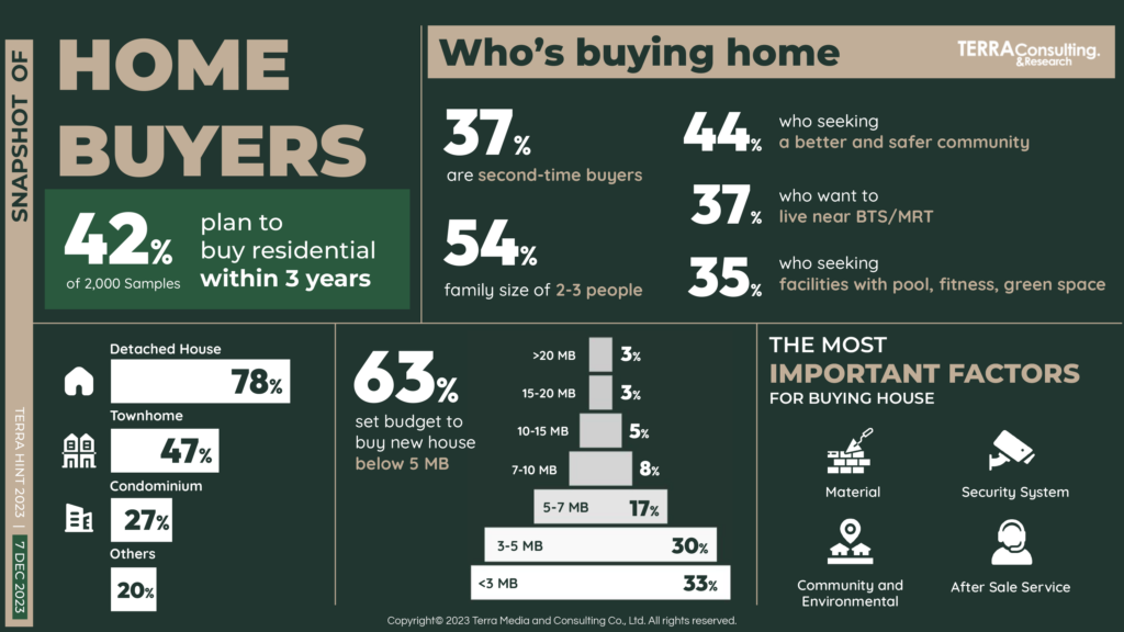 TERRA BKK กล่าวว่า จากผลวิจัย The most powerful of real estate brand 2023 และเจาะลึกพฤติกรรมผู้บริโภคตามแนวคิด Well-Being and Sustainable Lifestyle จากแบบสอบถามกับกลุ่มตัวอย่าง 2,000 คน พบว่า ผู้ตอบกว่า 42% มีแผนจะซื้อบ้านในช่วง 3 ปี โดยส่วนใหญ่มีความต้องการซื้อบ้านเดี่ยวและทาวน์โฮม ในระดับราคาตั้งแต่ 3 – 7 ล้านบาท โดยปัจจัยสำคัญที่ทำให้ตัดสินใจซื้อบ้านปีนี้คนส่วนใหญ่ให้ความใส่ใจเรื่องวัสดุก่อสร้างกันมากขึ้น รองลงมาคือ ระบบรักษาความปลอดภัย, สังคมและสิ่งแวดล้อมและบริการหลังการขาย