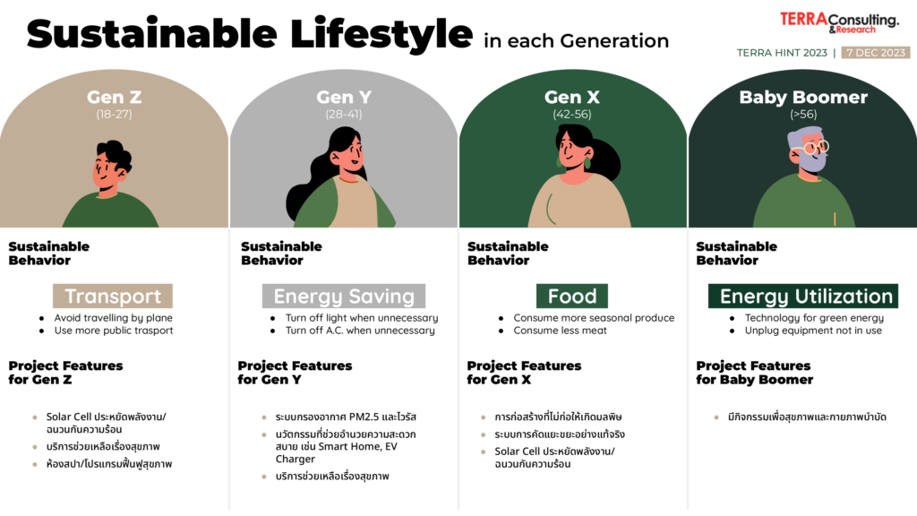 ทั้งนี้จากผลวิจัยจะเห็นว่า sustainable lifestyles ของคนแต่ละกลุ่มมีพฤติกรรมที่แตกต่างกัน โดยกลุ่ม Gen Z (อายุ 18-27 ปี) จะเป็นกลุ่มที่ใส่ใจเรื่องการเดินทาง โดยส่วนใหญ่จะเน้นการใช้ระบบขนส่งสาธารณะกันมาก ส่วนกลุ่ม Gen Y (อายุ 28-41 ปี) ให้ความใส่ใจด้านพลังงานเช่นการเปิด-ปิดไฟเมื่อไม่จำเป็น, กลุ่ม Gen X (อายุ 46-56 ปี) จะเป็นคนที่สนใจเรื่องอาหาร และสุขภาพ เช่น ลดการกินเนื้อสัตว์ หรือกินพืชผักตามฤดูกาล และกลุ่ม Baby boomer (อายุมากกว่า 56 ปีขึ้นไป) เป็นกลุ่มที่มีความน่าสนใจมาก เพราะคนกลุ่มนี้หันมาให้ความสำคัญกับเรื่องเทคโนโลยีสีเขียวเช่น โซล่าร์เซลล์ มากขึ้น