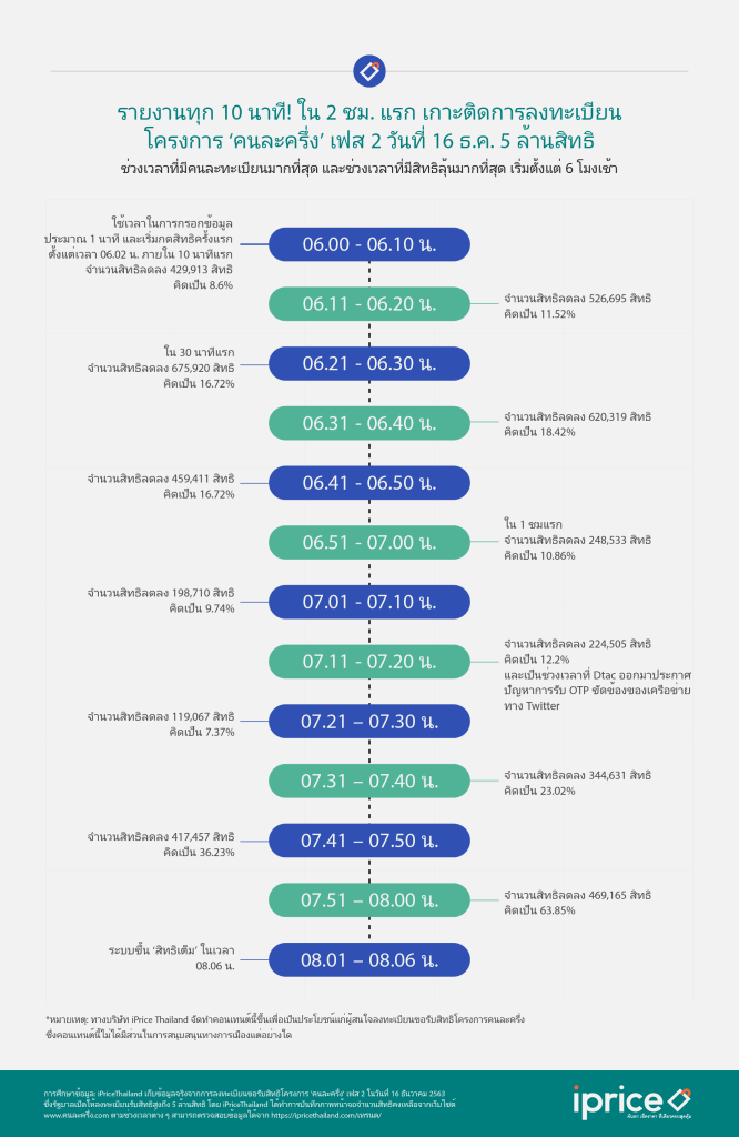ทำให้หลายคนที่พลาดรอบที่แล้วพอจะใจชื้นขึ้น แต่ก็ดูเหมือนว่าจำนวนสิทธิก็ยังไม่เพียงพอต่อความต้องการ เพราะสิทธิเต็มตั้งแต่สองชั่วโมงแรก ก่อเกิดความท้อใจให้ผู้ลงทะเบียนที่ต่อคิวรับสิทธิตั้งแต่ 6.00 น. เป็นเหตุให้ iPrice Thailand บริษัทวิจัยตลาด วิเคราะห์ข้อมูลช่วงเวลาที่มีผู้ลงทะเบียนมาก-น้อย เพื่อเป็นคู่มือเตรียมพร้อมสำหรับการลงทะเบียนรับสิทธิคราวต่อไป (ถ้ามี) และคาดว่าหากมีโครงการอื่นของรัฐบาลที่มีผู้สนใจมากอีก คู่มือนี้ก็พอจะคาดการณ์ช่วงเวลาที่มีผู้ลงทะเบียนมาก-น้อยที่อาจนำมาประยุกต์ใช้ได้บ้าง โดยมีไฮไลท์ที่สำคัญมีดังนี้