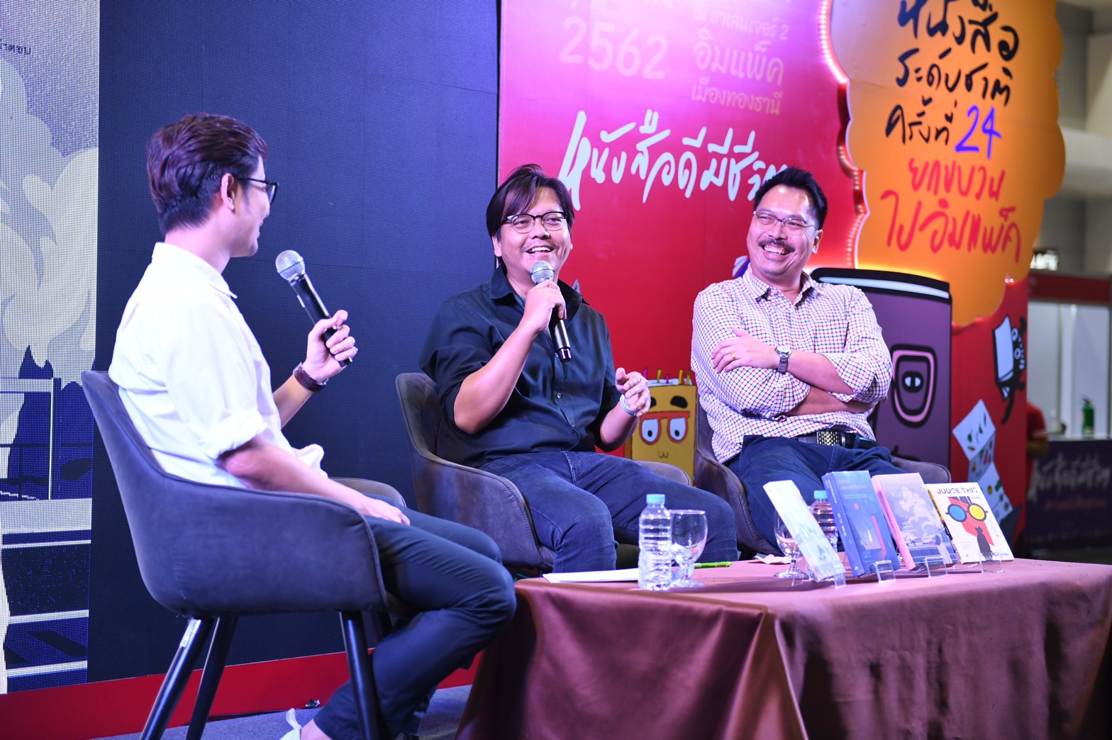 คุณกัญญภัทร สุขสมาน ผู้ช่วยผู้อำนวยการธุรกิจสื่อสิ่งพิมพ์ บริษัท โมโน เจนเนอเรชั่นจำกัด  พร้อมด้วย คุณจีระวุฒิ เขียวมณี บรรณาธิการสำนักพิมพ์ บริษัท โมโน เจนเนอเรชั่น จำกัด ในเครือ โมโน กรุ๊ป และ คุณวีระวัฒน์ เตชะกิจจาทรบรรณาธิการต้นฉบับและนักแปล จากสำนักพิมพ์ Move Publishing (มูฟ พับลิชชิ่ง) ร่วมพูดคุยถึงหนังสือดีที่ไม่ควรพลาดติดตาม อาทิ “ฆาตกรรมคืนฝนดาวตก”, “รักในโลกพิศวง” โดย ฮิงาชิโนะ เคโงะ“อยากกู่ร้องบอกรักให้ก้องโลก” โดย เคียวอิจิ คาตายามะ และ “JUDGE THIS” เขียนโดยนักออกแบบระดับโลก CHIP KIDD (ชิป คิดด์) ณ เวทีกลาง งานมหกรรมหนังสือระดับชาติ ครั้งที่ 24 อาคารชาเลนเจอร์ 2 อิมแพ็ค เมืองทองธานี เมื่อวันก่อน