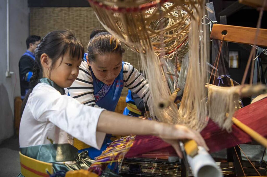 นอกจากนี้ คณะสื่อยังได้เยี่ยมชมบ้านพักโบราณไต้ฝู่ตี้ (Daifudi) พร้อมรับฟังการขับร้องเพลงพื้นบ้านอย่างอบอุ่น เพื่อเรียนรู้เทคนิคการทอผ้าจ้วงโบราณ (Zhuang brocade) ของซินเฉิง ซึ่งเป็นมรดกทางวัฒนธรรมที่ไม่สามารถจับต้องได้ คุณมาโนลี่ เกอคุนบอริศักดิ์ (Manoly Keokhounborisack) พิธีกรจากวิทยุแห่งชาติลาว กล่าวแสดงความประทับใจว่า “โรงงานแปรรูปไหมที่นี่มีขนาดใหญ่และใช้เทคโนโลยีขั้นสูงอย่างไม่น่าเชื่อ น่าประทับใจจริง ๆ จากการได้สัมผัสการทอผ้าจ้วงด้วยตัวเองและการเยี่ยมชมสถานที่ ทำให้ฉันเห็นว่าจีนได้ทำได้ดีเยี่ยมในการอนุรักษ์และสืบสานวัฒนธรรมชนเผ่าที่โดดเด่นของตนไว้”