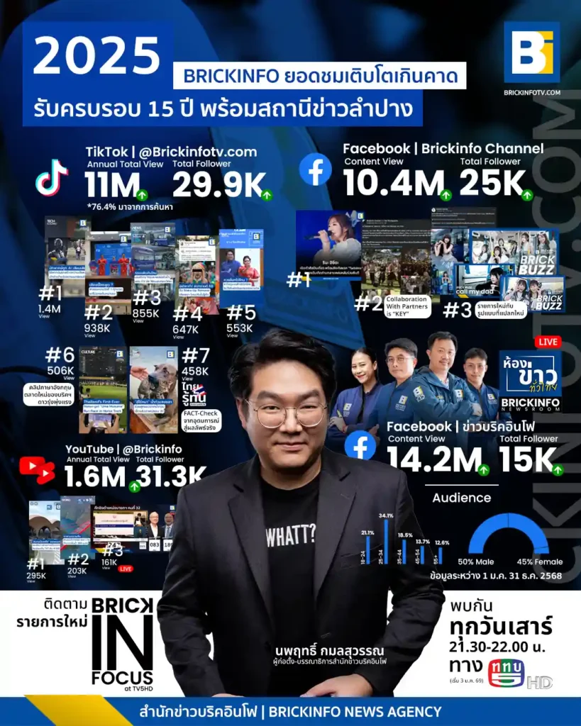 สำนักข่าวบริคอินโฟ – นพฤทธิ์ กมลสุวรรณ ผู้ก่อตั้งและบรรณาธิการสำนักข่าวบริคอินโฟ (Brickinfo) สรุปภาพรวมการทำงานส่งท้ายปี 2568 ชี้ปีนี้เติบโตแบบก้าวกระโดดในทุกกลุ่มเป้าหมาย (Segment) สอดรับวาระครบรอบ 15 ปี และความสำเร็จจากการจัดตั้งสถานีข่าวที่จังหวัดลำปาง ส่งผลให้ยอดผู้ติดตามและยอดการเข้าถึงเนื้อหาเพิ่มสูงขึ้นในทุกช่องทาง