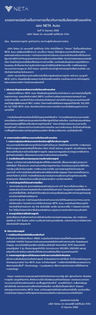 Hozon expressed gratitude to government agencies, partners, dealerships, and customers for their continued trust and support. The company pledged transparent communication and regular progress reports throughout the restructuring and recovery process, expressing confidence that with collective support, NETA Auto will emerge stronger and contribute to the growth of China’s new energy vehicle industry.