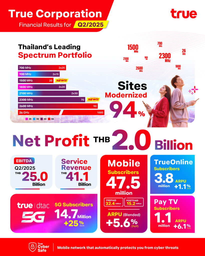 Brickinfo News Agency – True Corporation Plc. has announced a net profit after tax of THB 2.0 billion for the second quarter of 2025, marking the second consecutive quarter of profitability for the company. The results were driven by ongoing operational efficiencies and synergy realization following the amalgamation with DTAC. While total revenue saw a decline, primarily due to a network outage and other factors, the company reported a normalized profit of THB 4.2 billion for the period after excluding one-off items. True’s EBITDA also improved, with the company’s leverage ratio decreasing from the previous year.
