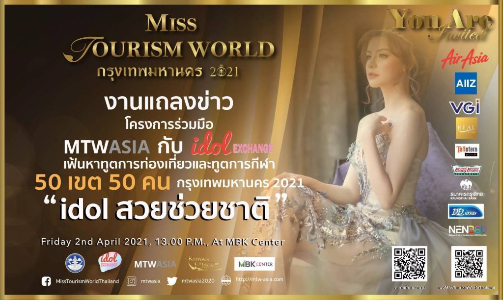 กรุงเทพมหานคร โดย สำนักวัฒนธรรมกีฬา และการท่องเที่ยว, MTWASIA และ Idol Exchange จับมือสร้างความแปลกใหม่บนโลกออนไลน์ ด้วยตำแหน่งทูตการท่องเที่ยว ที่จะทำหน้าที่ช่วยเหลือภาครัฐและเอกชน เข้าถึงกลุ่มชุมชนอย่างยั่งยืน ด้วยคอนเซ็ปท์ “Idol สวยช่วยชาติ” กับโปรเจ็กต์ Miss Tourism World Bangkok 2021 เฟ้นหาสาวไทยที่มีอายุ18-28ปี มาร่วมท้าทายด้วยกิจกรรมมากมายกับกูรูคนสำคัญ เพื่อผ่านเข้ารอบ ยกระดับให้เป็นผู้ทรงอิทธิพลบนโลกออนไลน์อย่างแท้จริง พร้อมรับสายสะพายอันทรงเกียรติจากผู้ว่าราชการกรุงเทพมหานคร ผู้อำนวยการสำนักวัฒนธรรมกีฬาและการท่องเที่ยว รองผู้ว่ากรุงเทพมหานคร ให้เป็นทูตการท่องเที่ยวและทูตการกีฬาประจำ50 เขต 50 คนของกรุงเทพมหานคร