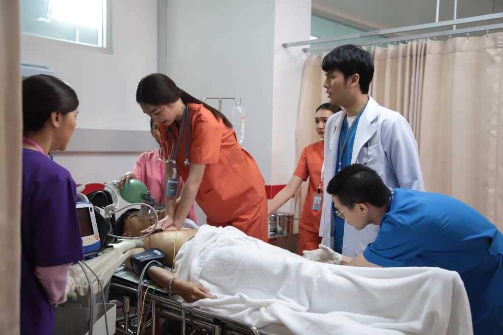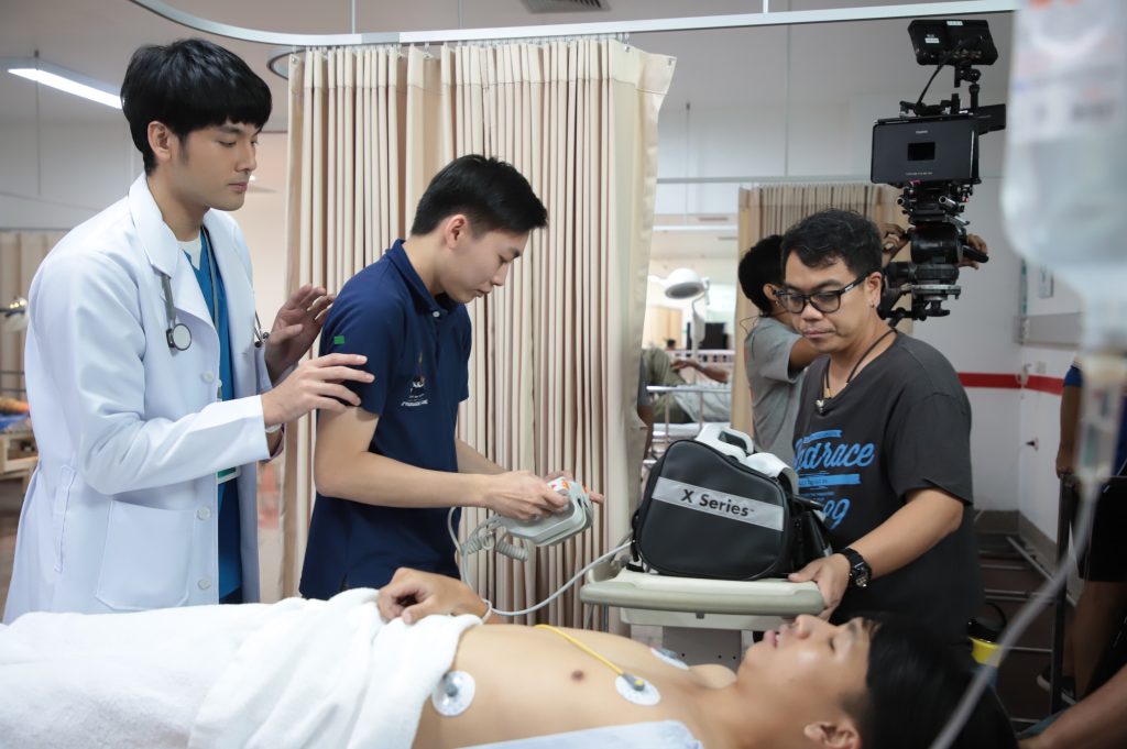 ฉากนี้ ถ่ายที่ โรงพยาบาลบุญญเวช ถือเป็นอีกฉากใหญ่ และสำคัญมาก เพราะมีทั้งภาพและอุปกรณ์ทุกอย่างเหมือนจริง ร่วมด้วยทีมแพทย์ตัวจริง มาร่วมแสดงด้วย เพื่อให้ข้อมูล และกำกับการช่วยชีวิตที่ถูกต้องในยามฉุกเฉิน เรียกว่าระหว่างการถ่ายทำ ความกดดันตกมาอยู่ที่นักแสดง มิ้นท์ และบอม เต็มๆ เพราะนอกจากต้องจำขั้นตอน ท่าทาง และเครื่องมือแล้ว อารมณ์ก็ต้องมาเต็ม ก่อนถ่ายจริง บอมยกมือไหว้บอกกล่าวก่อนถ่ายทำ ส่วนโดนัทก็ประกบมิ้นท์แบบระยะประชิด อธิบายอารมณ์ที่ต้องการ เมื่อเห็นแววตาและอารมณ์ของมิ้นท์กำลังได้ที่ เดินกล้องถ่ายจริงทันที มิ้นท์กำลังปั๊มหัวใจคนไข้อย่างเต็มที่ แต่สัญญาณชีพก็ยังไม่มา มิ้นท์ไม่ละความพยายาม ปั๊มหัวใจต่อเนื่อง ทั้งน้ำตา บอมเห็นท่าไม่ดี ยื่นมือเข้าช่วยต่อ สิ้นเสียงคัท มิ้นท์ถอยหลังหลบไปยืนน้ำตาซึมไม่หยุด ภารกิจของมิ้นท์ บอม ในฉากนี้จะสำเร็จหรือไม่ ตามลุ้น วันพฤหัสบดีที่ 30 กันยายนนี้ เวลา 20.30 น. ทาง ช่อง 3 กด 33 #พฤษภาธันวารักแท้แค่เกิดก่อน #รักแท้แค่เกิดก่อน #พี่ไม่ได้แก่พี่แค่เกิดก่อน