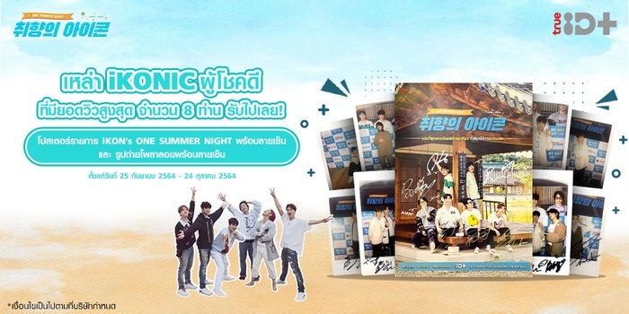 ฟินกันต่อเนื่องกับ “iKON’s ONE SUMMER NIGHT” รายการที่จะทำให้คุณรู้จักพวกเขามากขึ้น พบกับ iKON ทั้ง 6 ได้แก่ เจย์ ซง บ๊อบบี้ ดีเค ชาน จูเน่ แล้วมาล้วงความลับของพวกเขาในคืนฤดูร้อน เต็มอิ่ม 12 ตอน แถม ทรูไอดี พลัส ใจดี มีมาแจก ห้ามพลาดสำหรับเหล่า iKONIC มีสิทธิ์รับของรางวัลพิเศษ เพียงดูรายการ iKON’s ONE SUMMER NIGHT สูงที่สุด เพียง 8 คนแรก รับไปเลยโปสเตอร์พร้อมลายเซ็น และ รูปถ่ายโพลารอยซ์ พร้อมลายเซ็น ร่วมสนุกได้ตั้งแต่ 25 ก.ย. 64 – 24 ต.ค. 64 ดูย้อนหลังครบทุกตอนได้ที่ https://ttid.co/2EOQ/976679