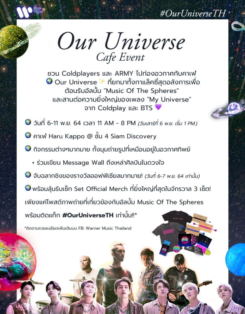 เพื่อต้อนรับการกลับมาแบบประสบความสำเร็จสุดๆ เริ่มต้นจากการให้ศิลปินระดับหัวแถวของบ้านเรา Gongkan (ก้องกาน) มาวาดภาพเอเลียน ที่สร้างสรรค์จากจินตนาการสุดบรรเจิด ที่แหล่งรวมงานศิลปะทุกแขนง Warehouse 30 ในย่านเจริญกรุงแล้ว ทาง Warner Music Thailand (วอร์เนอร์ มิวสิค ประเทศไทย) ก็ยังมีงานคาเฟ่อีเวนต์ เพื่อฉลองการออกอัลบั้ม ‘Music of the Spheres’ ในครั้งนี้ด้วยการจัดคาเฟ่อีเวนต์สุดพิเศษ “Our Universe” ที่จะรวมแฟนคลับของ Coldplay และ BTS ไว้ที่คาเฟ่ดัง ใจกลางกรุง Haru Kappo ใน Siam Discovery ในวันที่ 6 – 11 พฤศจิกายน (เฉพาะวันที่ 6 เริ่มเวลา 13.00 น.) ที่การันตีได้เลยว่า มาพร้อมกิจกรรมมากมาย ทั้งฝากข้อความถึงศิลปิน, ลุ้นของรางวัล Official merch มากมาย รวมถึงมุมถ่ายภาพเช็กอินคูลๆ เพื่อแสดงตัวการเป็นแฟนพันธุ์แท้ของทั้งสองศิลปิน