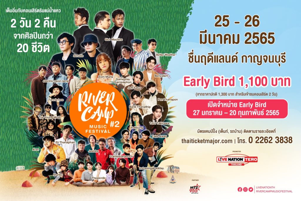 เปิดศักราชใหม่ ไลฟ์ เนชั่น เทโร (Live Nation Tero) เตรียมจัดงาน “ริเวอร์แคมป์ มิวสิค เฟสติวัล #2” เทศกาลดนตรีและแคมป์ปิ้งสุดชิคริมแม่น้ำแคว แห่งเดียวในเมืองกาญจน์ ที่จัดเต็มทัพศิลปินแถวหน้าหลากแนวดนตรี กว่า 20 ชีวิต นำโดยวงร็อคไทยระดับอินเตอร์ SLOT MACHINE และ SCRUBB คู่หูดูโอ้ขวัญใจชาวอินดี้ตลอดกาล ร่วมด้วย ZOM MARIE ศิลปินสาวเสียงใสมากเพลงฮิต BETTER WEATHER 3 หนุ่มสุดอบอุ่นที่จะมาพร้อมกับเพลงชิลๆ ฟังสบาย และศิลปินอีกมากมาย ในวันที่ 25-26 มีนาคมนี้ ณ ชื่นฤดีแลนด์ อำเภอเมือง จังหวัดกาญจนบุรี