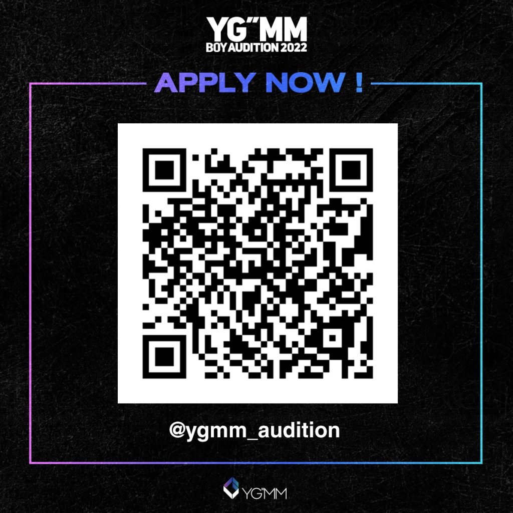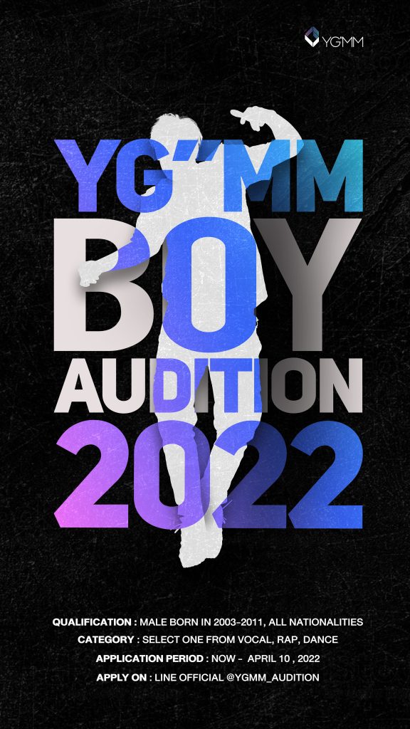 ประเดิมโปรเจกต์แรกของปี กับ YG”MM Boy Audition 2022 การเปิดรับสมัครออดิชั่นเด็กฝึกเพศชายทุกคนที่มีความสามารถน่าสนใจ ไม่จำกัดสัญชาติ มีอายุตั้งแต่ 10 – 20 ปี (เกิดระหว่างปี พ.ศ. 2546 – 2554) กรอกใบสมัครพร้อมส่งคลิปความสามารถของตนเองเข้ามา ไม่ว่าจะเป็น คลิปการร้อง (Vocal) คลิปการแรป (Rap) หรือ คลิปการเต้น (Dance) ซึ่งทาง YG”MM จะมีคณะกรรมการของบริษัทที่ทำงานร่วมกันจากทั้งสองประเทศเป็นผู้พิจารณาคัดเลือกอย่างละเอียด ผู้สมัครที่ผ่านการคัดเลือกจะได้รับการติดต่อกลับเป็นรายบุคคล ก่อนเข้าสู่กระบวนการออดิชั่นในรอบถัดไป