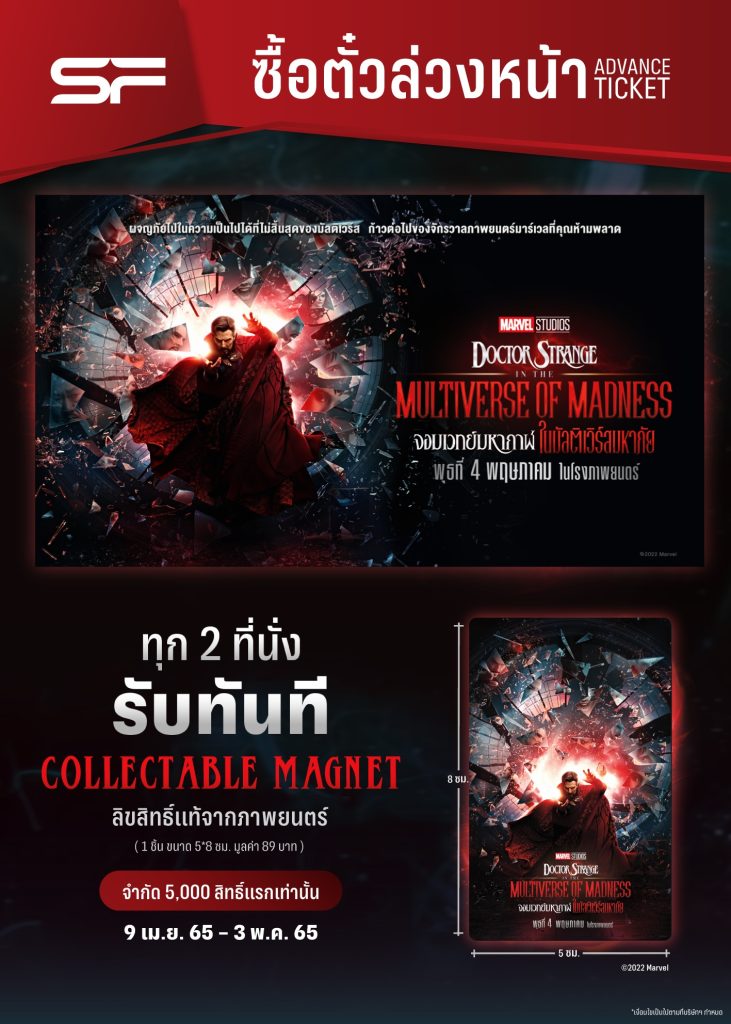 โรงภาพยนตร์ในเครือ เอส เอฟ พร้อมต้อนรับภาพยนตร์ฮีโร่มาร์เวลฟอร์มยักษ์ที่คนทั้งโลกรอคอย “Doctor Strange in the Multiverse of Madness (จอมเวทย์มหากาฬ ในมัลติเวิร์สมหาภัย)” ที่สร้างกระแสจนติดเทรนด์โลกทุกครั้งที่การปล่อยตัวอย่างออกมา ภาพยนตร์มีกำหนดเข้าฉายในวันที่ 4 พฤษภาคม 2565 โดยสามารถซื้อบัตรชมภาพยนตร์ล่วงหน้าได้ตั้งแต่วันที่ 9 เมษายน เวลา 00.00 น. เป็นต้นไป ผ่านทางแอปพลิเคชัน SF Cinema และ www.sfcinema.com พิเศษเมื่อซื้อบัตรชมภาพยนตร์ทุก 2 ที่นั่ง รับทันที COLLECTABLE MAGNET ลิขสิทธิ์แท้จากมาร์เวลให้แฟนภาพยนตร์ได้สะสม