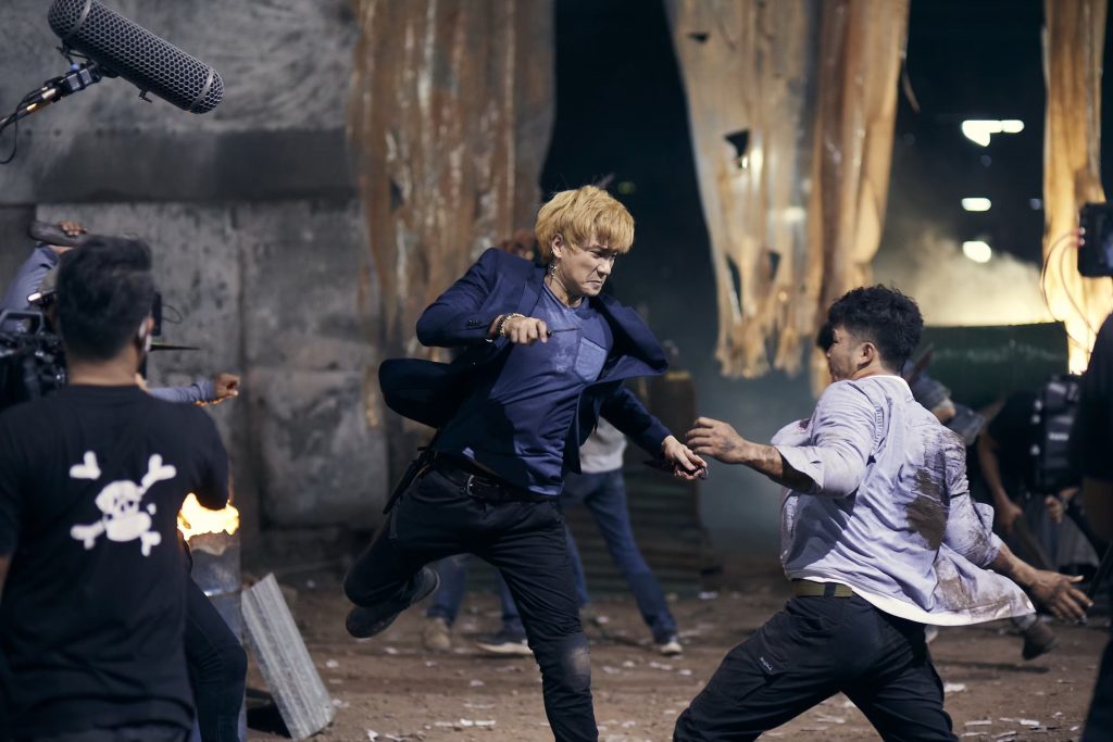 น่าจะเป็นฉากเปิดตัวครับ คือเปิดใหญ่มาก็ซีนใหญ่ คิวเยอะและทำงานกับพี่ๆ หลายคน มันจะยากในเรื่องของโลเคชั่นด้วยที่มันไม่ค่อยเอื้ออำนวย เพราะว่าเป็นพื้นหินกรวด และเราต้องบู๊หนักตรงนั้น เป็นโรงงานโกดังเก่า และเราจะต้องมีขึ้นสลิงด้วย ซึ่งสูงมาก ก็จะมีความอันตราย ตอนซ้อมมันเตี้ยกว่านั้น แต่พอถ่ายจริงมันสูงและมีที่กั้นเยอะ แต่ว่าก็ผ่านมาได้ ฉากนี้ไม่ใช่ครั้งแรกที่เข้าฉากในเรื่อง ส่วนฉากแรกเป็นฉากแอ็คชั่นเหมือนกันเข้ากับพี่ลีโอ พุฒ อันนั้นก็เดือดเหมือนกัน เพราะเราไม่เคยเข้ากองเลย แล้วเปิดมาวันแรกบู๊ทั้งวัน 2 ซีน ตั้งแต่เช้ายันเย็นก็คือวัดดวงกันไปเลย ในเรื่องก็จะมีหลายซีนที่ผมได้เล่นแอ็คชั่นที่ท้าทาย ผมว่าเรื่องนี้คุณโจ เขาก็ตั้งใจมาก หนังแบบนี้บ้านเราไม่ค่อยมีที่บทมันจะไปสุดขนาดนี้ แอ็คชั่นสุดขนาดนี้ ตลกสุด เพี้ยนสุด มันรวมหลายๆ อย่างไว้ด้วยกัน ผมเต็มที่กับเรื่องนี้มากจริงๆ ด้วยความที่ อินเทนโซ่ จะเก่งอาวุธมีด ผมก็ไปลงเรียนเองเลยกับครูที่สอนมีดสั้นโดยเฉพาะ ไปเรียนมาประมาณเดือนสองเดือนก่อนถ่ายทำครับ คือเป็นมีดสั้นที่ผมจะต้องควงมีดให้ได้ มีนักแสดงคนหนึ่งชื่อ เจสัน สเตแธม ซึ่งเขาเท่มากเป็นนักแสดงฮอลลีวู้ด ผมชอบเขาบู๊แล้วเขาก็มีมีดแบบนี้ ผมก็เลยไปหาซื้อมาจากอเมริกา แล้วก็เอามีดนี้ไปเสนอ คุณโจกับพี่โน้ต ผู้กำกับฯ ก็เลยตกลงว่าเป็นอันนี้ เราก็เลยไปเรียนเพิ่มว่ามันทำงานยังไง ใช้ยังไง ให้มันคล่องครับ เพราะว่ามันต้องมีเหตุผลของการทำทั้งหมด ไม่งั้นคนดูจะไม่เชื่อเลย กลายเป็นว่าเราแค่โบกมีด เล่นหมุนไม่เก่งก็จะทำไปเพื่ออะไร คือเราอยากให้คนดูได้เหตุผลของการกระทำในซีนนั้นด้วย เพราะว่าทุกอย่างมันต้องมีเหตุผล ก็เลยจะมีมีดของผมจริงๆ เข้าฉากด้วย อินเทนโซ่จะเป็นตัวละครที่หนักในด้านบู๊เยอะมาก กับพี่ธันน์ ธนากร สองคน ซึ่งเราจะอยู่ทีมเดียวกัน คือผม พี่ธันน์ แล้วก็จีน่า เราเป็นองครักษ์พิทักษ์บอสคนเดียวกัน