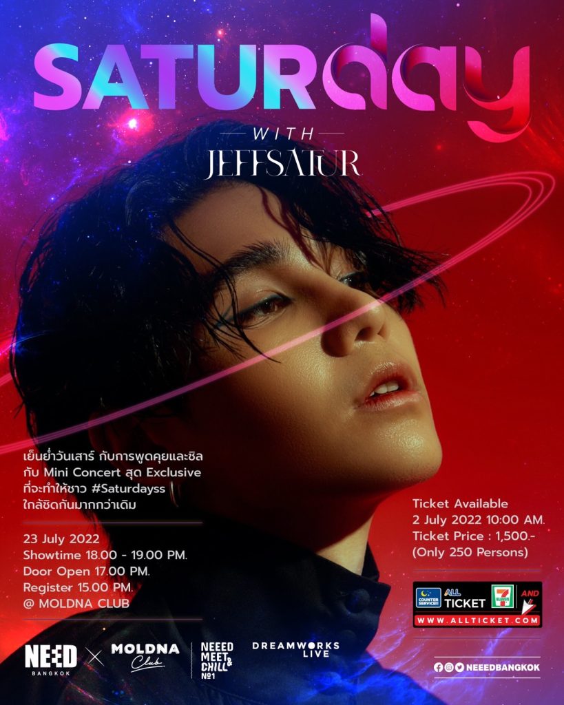 เปิดประเดิมครั้งแรกภายใต้ชื่อ NEEED MEET & CHILL #1SATURDAY with JEFFSATUR กับ ศิลปินสุดร้อนแรงอย่าง เจฟ-วรกมล ซาเตอร์ หรือ เจฟ ซาเตอร์ (Jeff Satur) ดีกรีนักร้องเสียงคุณภาพค่าย Wayfer Records ในสังกัด Warner Music Thailand และนักแสดงมากความสามารถจาก KinnPorsche The Series การันตีความฮอต ที่บ้านแฟนอย่าง #Saturdayss ไม่ควรพลาด