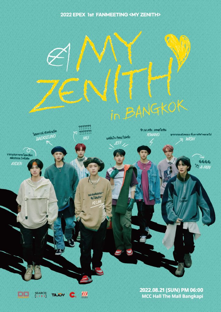EPEX (อีเพ็กซ์) บอยกรุ๊ปสุดฮอตจากค่าย C9 Entertainment เตรียมบุกไทยยึดพื้นที่หัวใจแฟนคลับ จัดงานแฟนมีตติ้งครั้งแรกในประเทศไทย 2022 EPEX 1st Fan Meeting ‘MY ZENITH’ in Bangkok ในวันอาทิตย์ที่ 21 สิงหาคมนี้ เวลา 18:00น. ที่ เอ็มซีซีฮอลล์ เดอะมอลล์บางกะปิ จัดโดยบริษัท ดูคอนเสิร์ต จำกัด และ บริษัท เซิร์ช (ไลฟ์) จำกัด
