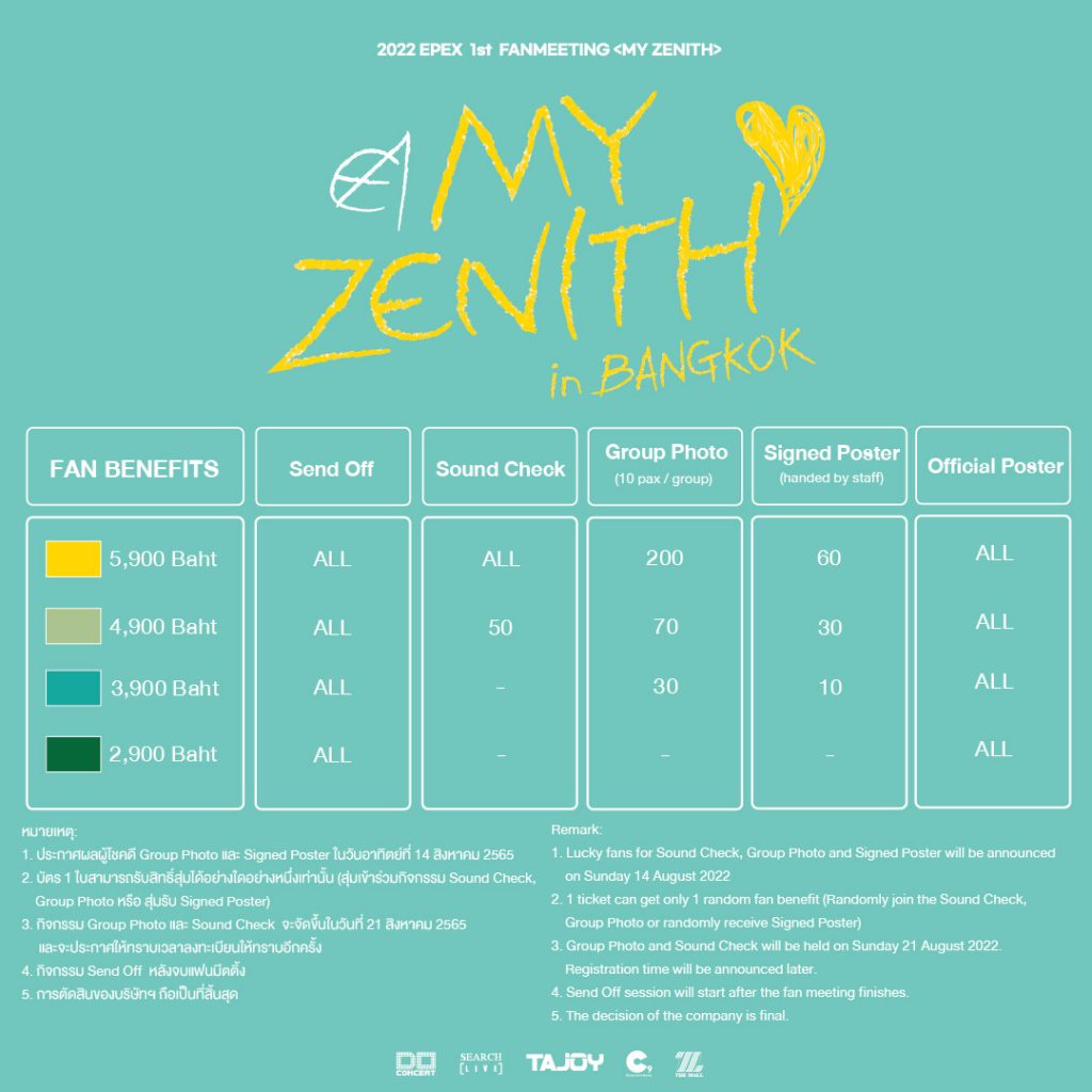 EPEX (อีเพ็กซ์) พร้อมแล้วที่จะมากระแทกใจชาวเจนิซประเทศไทย ให้หวั่นไหวไปกับความน่ารักของเมมเบอร์ และเพอร์ฟอร์มแมนซ์สุดเพอร์เฟ็คต์ที่เตรียมตัวมาเป็นพิเศษ ในงานแฟนมีตติ้งครั้งแรกในประเทศไทย 2022 EPEX 1st Fan Meeting ‘MY ZENITH’ in Bangkok วันอาทิตย์ที่ 21 สิงหาคม 2565 เวลา 18:00น. ที่ เอ็มซีซีฮอลล์ เดอะมอลล์บางกะปิ เปิดจำหน่ายบัตรทาง www.doconcert-ticket.com วันอาทิตย์ที่ 17 กรกฎาคมนี้ เวลา 10:00น. เป็นต้นไป บัตรราคา 5,900/4,900/3,900/2,900 บาท พร้อมรับสิทธิพิเศษมากมายในแต่ละราคา เช่น การเข้าชมรอซ้อม การถ่ายรูปกลุ่ม ได้รับโปสเตอร์พร้อมลายเซ็น เป็นต้น สามารถติดตามรายละเอียดเพิ่มเติมได้ที่โซเชียลมีเดีย @doconcert ทุกช่องทางหรือ #EPEX1stFM_BKK