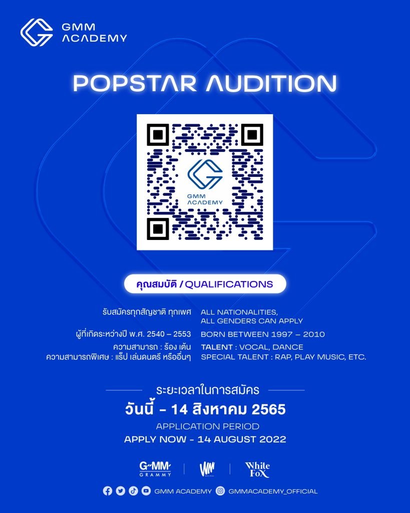 จีเอ็มเอ็ม อะคาเดมี่ เปิดรับสมัครน้องๆที่มีความฝันอยากเป็นศิลปินไม่ว่าจะเป็น ป๊อป ไอดอล, ร็อค, อินดี้ ลูกทุ่ง และ ไทดอล  ทั้งชายและหญิง  ที่มีอายุระหว่าง 12-25 ปี (เกิดปี พ.ศ.2540 – 2553) มาออดิชั่น เพื่อเข้าเป็นศิลปินฝึกหัดภายใต้สังกัด จีเอ็มเอ็ม อะคาเดมี่ เปิดรับสมัครตั้งแต่วันนี้เป็นต้นไป สามารถติดตามรายละเอียด การสมัครได้ที่ LINE OFFICIAL @GMMACADEMY ได้ที่ https://bit.ly/GMMACADEMY และติดตามข่าวสารของจีเอ็มเอ็ม อะคาเดมี่ ผ่านช่องทาง Social media ดังต่อไปนี้ FACEBOOK  https://www.facebook.com/GMM-Academy-112374444850254 , IG  https://www.instagram.com/gmmacademy_official/ , TWITTER  https://twitter.com/gmm_academy , TIKTOK https://www.tiktok.com/@gmmacademy