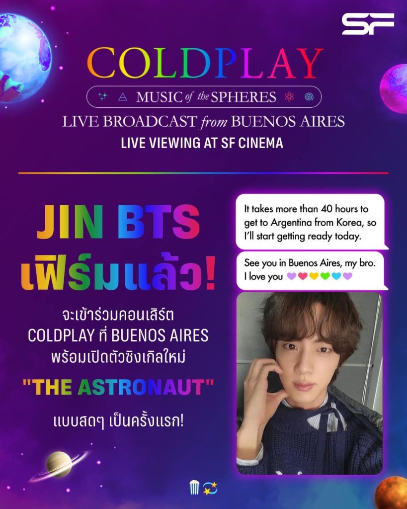 โรงภาพยนตร์ในเครือ เอส เอฟ เอาใจแฟนคลับวงร็อคระดับโลก COLDPLAY (โคลด์เพลย์) เตรียมฉาย “COLDPLAY MUSIC OF THE SPHERES LIVE BROADCAST FROM BUENOS AIRES : LIVE VIEWING AT SF CINEMA” ถ่ายทอดสดการแสดงคอนเสิร์ตจากเมืองบัวโนสไอเรส ประเทศอาร์เจนตินา มาให้ชาวไทยได้ดูพร้อมกับแฟนๆ อีกกว่า 70 ประเทศทั่วโลก บนจอยักษ์พร้อมระบบเสียงสมบูรณ์แบบ พร้อมเซอร์ไพรส์กับแขกรับเชิญสุดพิเศษ “จิน BTS (JIN)” ที่จะมาร่วมสร้างความมันส์ ในวันที่ 29 ตุลาคม 2565 รอบเวลา 15.30 น. และ 19.00 น. เฉพาะที่โรงภาพยนตร์ในเครือ เอส เอฟ เท่านั้น