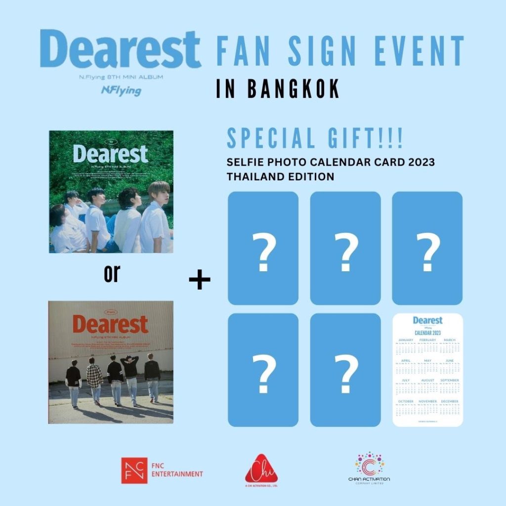 เพียงพรีออเดอร์ผลงานมินิอัลบั้มชุดที่ 8 “Dearest” ของ “เอ็น.ฟลายอิ้ง” ผ่านทาง https://ticket.achi.co.th ทั้งในรูปแบบอัลบั้ม พร้อม RANDOM SELFIE PHOTO CALENDAR CARD 2023 Thailand Edition 1 เวอร์ชั่น ในราคา 690 บาท หรือในรูปแบบแพ็คเกจ 5 อัลบั้ม พร้อม SELFIE PHOTO CALENDAR CARD 2023 ครบ 5 เวอร์ชั่น THAILAND EDITION ในราคา 3450 บาท ผู้ที่มียอดการสั่งซื้อสูงสุดจำนวน 20 ท่าน จะได้รับลายเซ็นและพูดคุยกับสมาชิกของวง “เอ็น.ฟลายอิ้ง” (1 นาที/สมาชิก) และภาพโพลารอยด์พร้อมลายเซ็น 1 ใบ/สิทธิ์ นอกจากนั้นยังสุ่มผู้โชคดีที่พรีออเดอร์อัลบั้ม อีก 80 ท่าน มีสิทธิ์รับลายเซ็นและพูดคุยกับสมาชิกของวง “เอ็น.ฟลายอิ้ง” (1 นาที/สมาชิก) เช่นกัน เริ่มเปิดพรีออร์เดอร์วันอาทิตย์ที่ 30 ต.ค.นี้ เวลา 12.00 น. ทาง https://ticket.achi.co.th/
