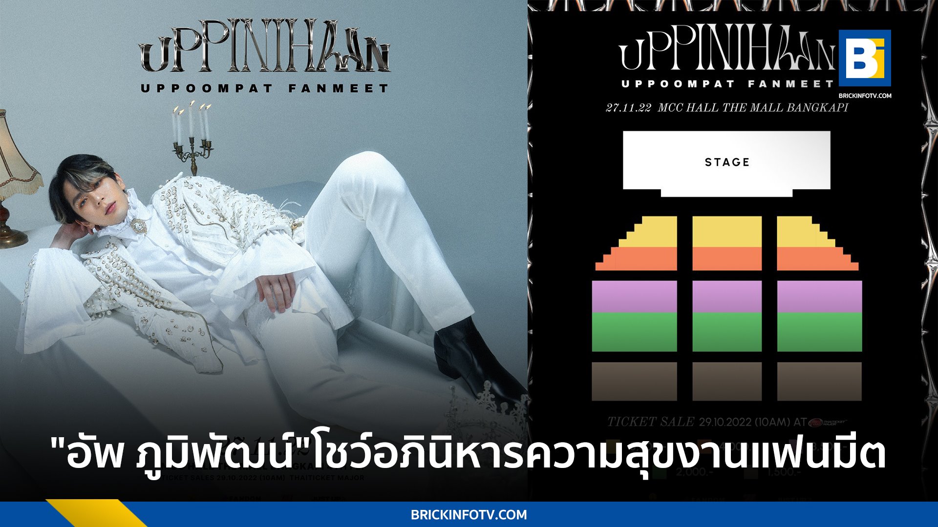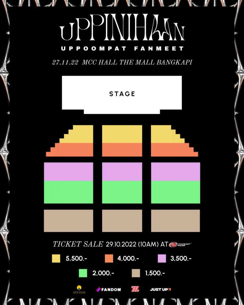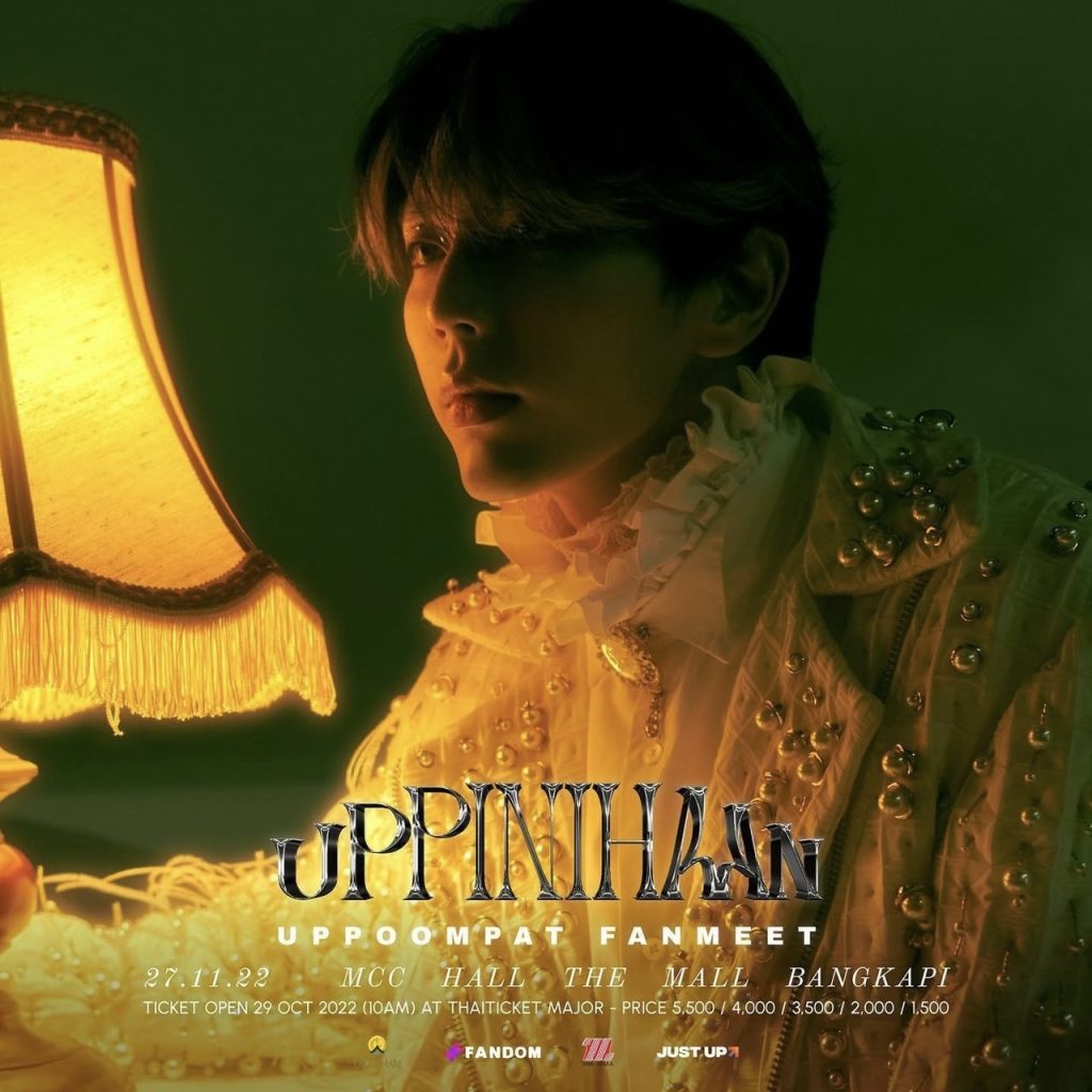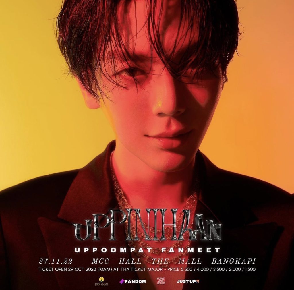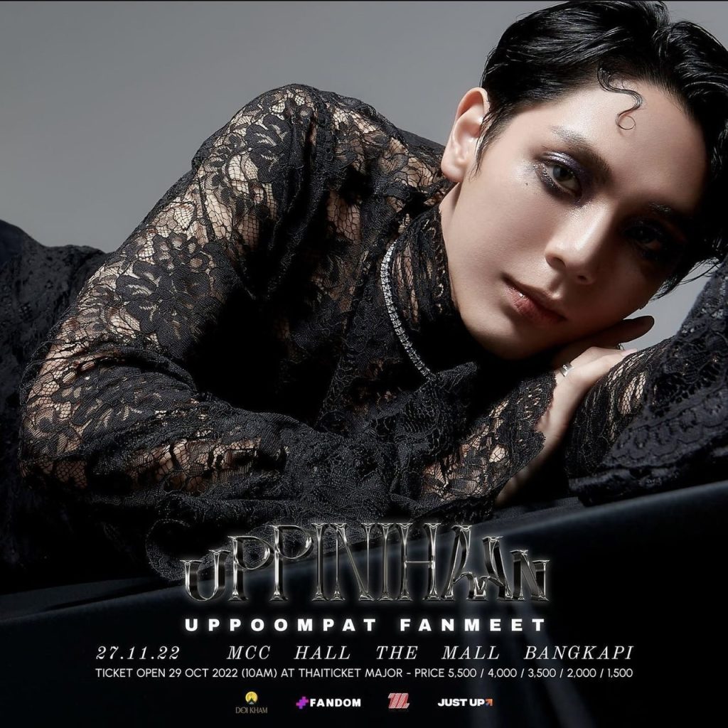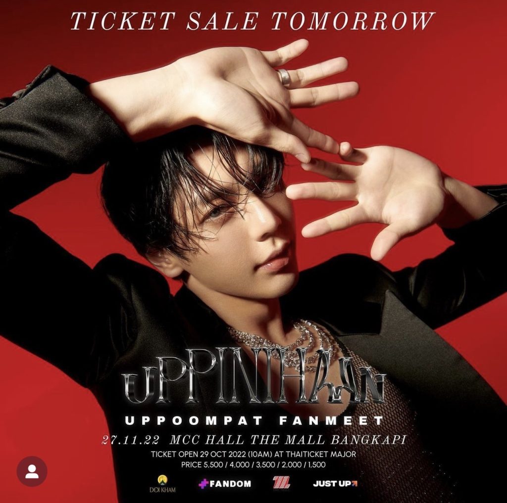 เปิดจำหน่ายบัตรตั้งแต่วันเสาร์ที่ 29 ตุลาคมนี้ เวลา 10:00 น. เป็นต้นไป ราคาบัตร 5,500 / 4,000 / 3,500 / 2,000 / 1,500 บาท ที่ www.thaiticketmajor.com (https://www.thaiticketmajor.com/concert/uppoompat-fanmeet-uppinihaan.html ) Call center โทร 0-2262-3456 และ ไทยทิคเก็ตเมเจอร์ทุกสาขา ติดตามรายละเอียดเพิ่มเติมได้ทาง Social Media ของ JustUp ทุกช่องทาง