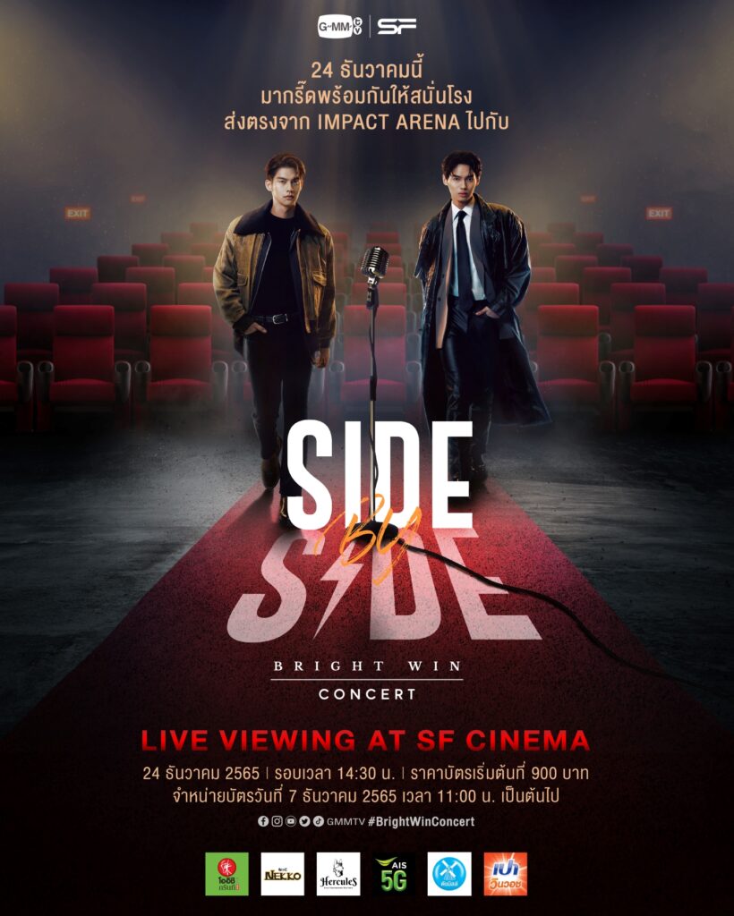 โรงภาพยนตร์ในเครือ เอส เอฟ จับมือ GMM TV เอาใจแฟนคลับ 2 หนุ่มสุดฮอต “ไบร์ท-วชิรวิชญ์ ชีวอารี” และ “วิน-เมธวิน โอภาสเอี่ยมขจร” เตรียมส่ง “SIDE BY SIDE BRIGHT WIN CONCERT : LIVE VIEWING AT SF CINEMA” การถ่ายทอดสดคอนเสิร์ตใหญ่ครั้งแรกในไทยมาให้แฟนๆ ได้รับชมสดพร้อมกรี๊ดสะใจ บนจอยักษ์ภาพคมชัดระดับ 4K และระบบเสียงที่สมบูรณ์แบบในโรงภาพยนตร์ เอส เอฟ ในวันเสาร์ที่ 24 ธันวาคม 2565 เวลา 14.30 น. โดยส่งตรงสัญญาณสดจากอิมแพ็ค อารีน่า เมืองทองธานี มายังโรงภาพยนตร์ เอส เอฟ 12 สาขาทั่วประเทศ ซึ่งครั้งนี้ถือเป็นครั้งแรกของการถ่ายทอดสดการแสดงคอนเสิร์ตศิลปินไทยแบบสตรีมมิ่งภายในโรงภาพยนตร์อีกด้วย