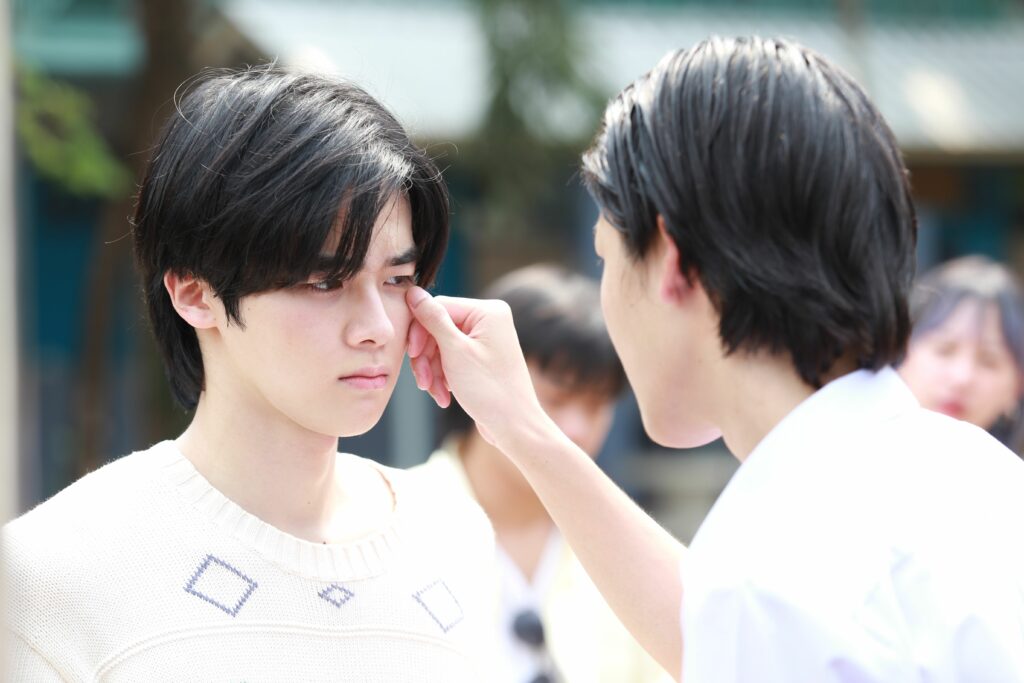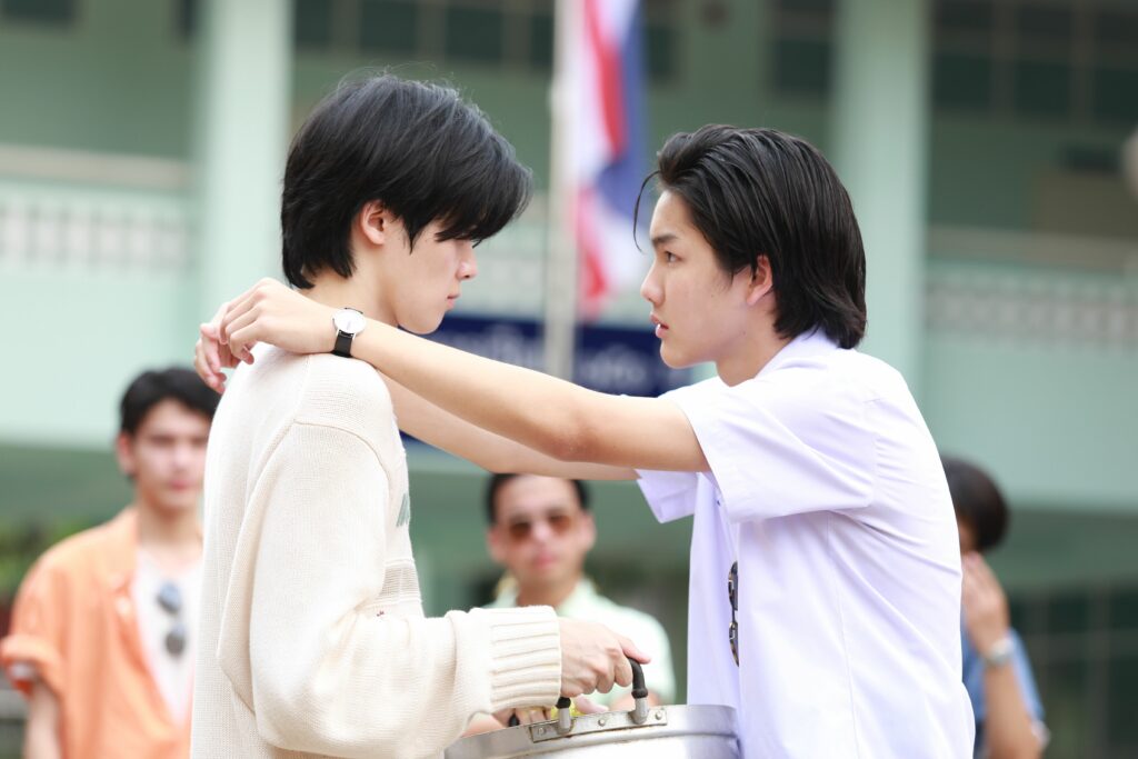 ซึ่งในฉากนี้ ต้องถ่ายทำกันกลางแจ้ง ณ ลานโล่งๆพร้อมแสงแดดแรงๆ ที่เล่นเอาตาหยีจนลืมกันแทบไม่ขึ้น งานนี้สุภาพบุรุษนอกจอ “ต้า” เลยอาสากางร่มให้ “บอม” ตอนที่ต้องซ้อมคิวต่างๆ ก่อนถ่ายจริง ไม่รู้ว่าที่ตั้งใจกางร่มให้เป็นอย่างดี เพราะซีนนี้ บอมจะต้องฮึดสู้ ประลองหมัดกับต้า เลยรีบดูแลเทคแคร์ก่อนจะมีวางหมัดบนหล่อหล่อๆรึป่าว แต่จะลงเอยแบบไหน ยังไง คงต้องให้ไปตามดูในซีรีส์ แต่ที่แน่ๆ พี่จะตีนะเนย อาจต้องเปลี่ยนเป็น พี่จะต่อยนะเนย แล้วละ