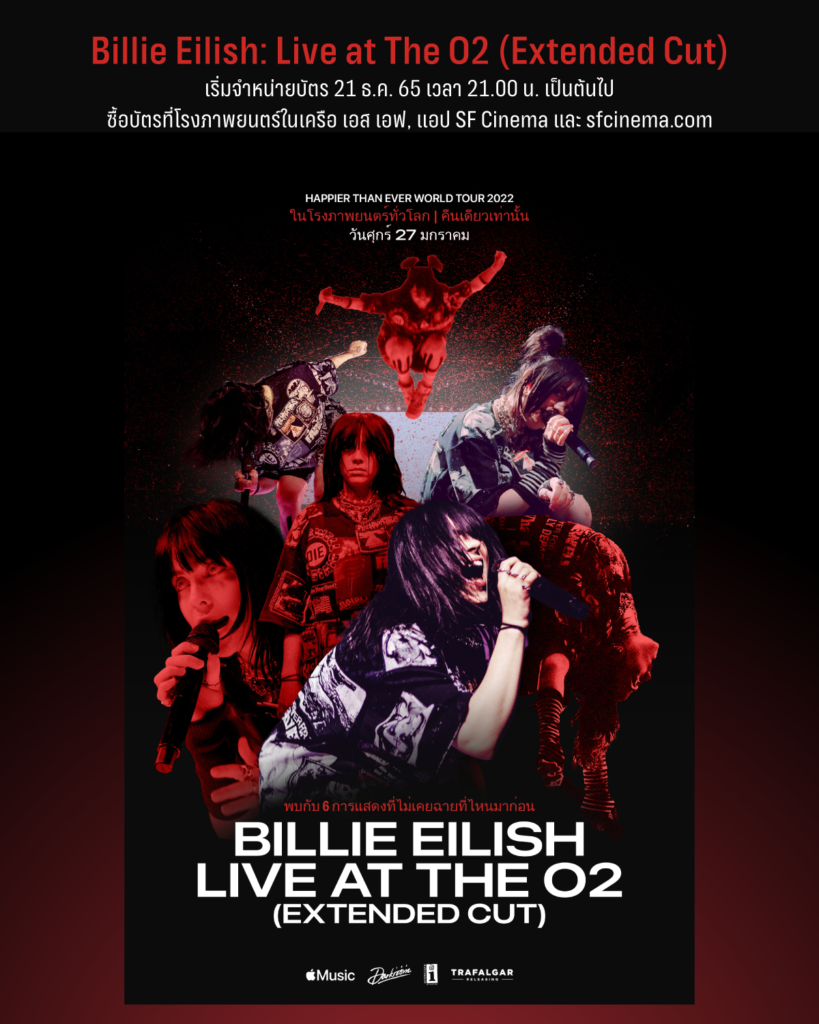 โรงภาพยนตร์ในเครือ เอส เอฟ ตอกย้ำความเป็นผู้นำคอนเทนต์พิเศษในโรงภาพยนตร์ เตรียมส่ง “Billie Eilish: Live at The O2 (Extended Cut)” กับบันทึกการแสดงคอนเสิร์ตของป๊อปสตาร์สาวขวัญใจคนทั่วโลก “Billie Eilish” (บิลลี่ ไอลิช) ที่ได้สร้างปรากฏการณ์ครั้งใหญ่ให้วงการดนตรี พร้อมการันตีด้วยรางวัลระดับโลกอีกมากมาย โดยครั้งนี้เตรียมจัดเต็มหลากหลายเพลงฮิตอย่าง Bad Guy, Therefore I Am, Bury a Friend, Happier Than Ever, Your Power และอีกมากมาย มาให้แฟนๆ ได้รับชมบนจอยักษ์ภาพคมชัดระดับ 4K และระบบเสียงที่สมบูรณ์แบบในโรงภาพยนตร์ เอส เอฟ 8 สาขาทั่วประเทศ ในวันศุกร์ที่ 27 มกราคม 2566 รอบเวลา 19.00 น.