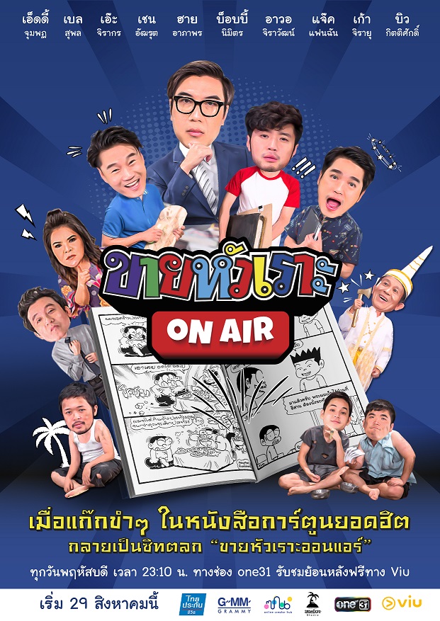 ในยุค 90 เชื่อว่าหลายๆ คนโตมากับ การ์ตูนขายหัวเราะ ที่สร้างความสุข รอยยิ้ม และจินตนาการ เติบโตคู่กับสังคมชาวไทยมายาวนาน จะเกิดอะไรขึ้นเมื่อมุขตลกจากหนังสือการ์ตูนยอดฮิต กลายเป็นซิทตลกออนแอร์ มาร่วมย้อนวันวานเหมือนได้อ่านหนังสืออีกครั้ง “ซน” Online Creator Hub หน่วยงานภายใต้ จีเอ็มเอ็ม แกรมมี่ ส่งรายการ “ขายหัวเราะ ON AIR” ทุกวันพฤหัสบดี เวลา 23:10-23:40 น ทางช่อง One 31 สานต่อ DNA ความสนุกจากหนังสือการ์ตูน ที่นำไฮไลท์ฉากเด็ด “ติดเกาะ /ติดทะเลทราย / ห้องรับแขก / เทพารักษ์ /ขอทาน / นักเขียน” มาถ่ายทอด โดยตลกตัวพ่อและศิลปิน จีเอ็มเอ็ม แกรมมี่ “เอ็ดดี้-จุมพฏ” เจ้าของเพจ ‘พี่เอ็ด7วิ‘ / เบล สุพล / เอ๊ะ จิรากร / เชน อัฒรุต / ฮาย อาภาพร /บ็อบบี้ นิมิตร / อาวอ จิราวัฒน์ / แจ๊ค แฟนฉัน / เก้า จิรายุ / บิว กิตติศักดิ์” พร้อมแขกรับเชิญซุปเปอร์สตาร์ชื่อดังตบเท้ามาร่วมสนุกในรายการอาทิฯ “นุ้ย ธนวัฒน์ / ซานิ นิภาภรณ์ / คชา นนทนันท์ / บุ๊คโกะ ธนัชพันธ์ / ดีเจโบ ธนากร / ซอ จียอน / ซัน ประชากร/ ดาว ขำมิน / ใบเฟิร์น พัสกร / แทค ภรัณยู” สร้างความสนุก สะท้อนฉากชีวิต สู่รอยยิ้ม เสียงหัวเราะ สอดแทรกข้อคิดสะท้อนสังคม และเรียกเสียงฮาแบบครบรส