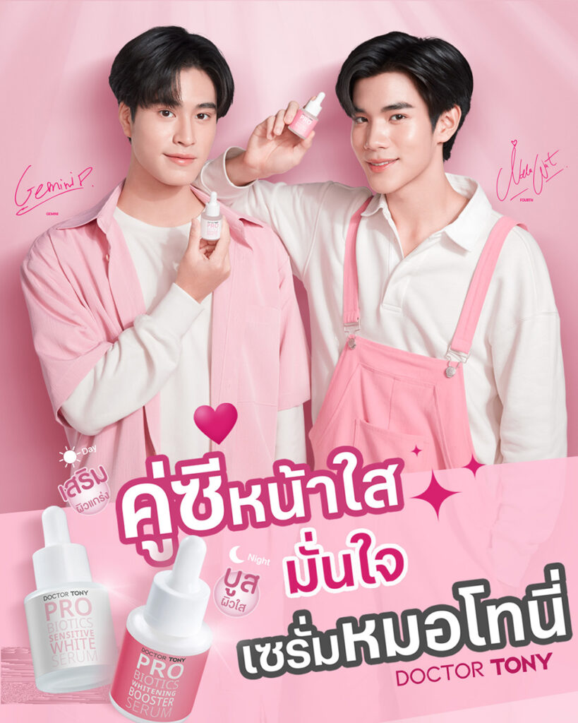 ปังไม่หยุดเมื่อคู่หูเพื่อนซี้ที่ฮอตที่สุดในนาทีนี้อย่าง เจมีไนน์ นรวิชญ์ ฐิติเจริญรักษ์ และ โฟร์ท ณัฐวรรธน์ จิโรชน์ธิกุล ควงคู่อวดผิวใสขึ้นแท่นแบรนด์แอมบาสเดอร์ (Brand Ambassador) สกินแคร์สุดฮอตน้องใหม่ “Doctor Tony Probiotics White Serum” หรือ “เซรั่มหมอโทนี่” โดย นายแพทย์วรพล สุขีวัฒนา หรือคุณหมอโทนี่ แพทย์ผู้เชี่ยวชาญด้านผิวพรรณและความงาม เจ้าของคลินิคเสริมความงามอันดับต้นๆของประเทศไทย Doctor Tony Medical Center ที่คร่ำหวอดในวงการแพทย์ด้านผิวพรรณมากว่า 15 ปี เซรั่มตัวนี้นับเป็นผลิตภัณฑ์ตัวแรกในกลุ่ม เวชสำอางในแบรนด์ DOCTOR TONY ที่มาในคอนเซปต์ “คู่ซี้หน้าใส มั่นใจเซรั่มหมอโทนี่” โดยทั้งคู่ได้เผยว่า ต้องการหาเซรั่มที่ไว้ใจได้ที่สามารถดูแลผิวหน้าได้อย่างปลอดภัย มีคุณภาพ โดยมีคุณหมอแนะนำว่าปลอดภัย พร้อมมีผล การวิจัยการันตี ซึ่งหลังจากที่ลองใช้ เซรั่มหมอโทนี่ หรือ Doctor Tony Probiotics White Serum ก็ตอบโจทย์ความ ต้องการ รวมถึงราคาที่จับต้องได้ จึงเป็นเหตุผลที่ทำให้มั่นใจรับหน้าที่เป็นแบรนด์แอมบาสเดอร์ให้กับ DOCTOR TONY ในครั้งนี้