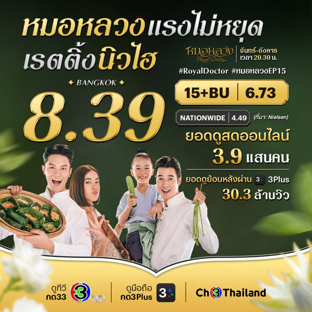 “หมอหลวง” ช่อง 3 ตอนนี้ถือได้ว่าเป็นละครที่แรงเกินต้าน!! จนกุมหัวใจคนทั้งประเทศ เรียกว่ามาแบบเหนือชั้นจริง ๆ เพราะเล่นโชว์ความเจ๋งครบทุกอย่าง ไม่ว่าจะเป็นศักยภาพของนักแสดง และเรื่องราวที่สนุกถูกจริตของคนไทยและน่าจับตามองทุกวินาที ล่าสุดได้ข่าวแว่วมาว่าอีพีในวันจันทร์-อังคารที่ 15-16 พฤษภาคมนี้ จะถึงจุดเปลี่ยน..หรือสัปดาห์นี้จะมีความสุขความน่ารักสุดท้าย จะใช่คู่ของทองอ้นกับแม่บัวหรือเปล่า? และสัปดาห์นี้จะเป็นการเรียนการสอนสุดท้าย จะเกิดเรื่องอะไรกันแน่!! ทำเอาอกอีแป้นจะแตกเพราะอยากรู้ใจจะขาดแล้ว แต่ที่รู้แน่ ๆ จนสะเทือนทั้งแผ่นดิน เพราะเรตติ้งละครนำ 1 ทุกอีพี ตอนล่าสุดของ “หมอหลวง EP.15” คว้าเรตติ้งกลุ่มผู้ชมอายุ 15 ปีขึ้นไป กลุ่ม (Bangkok and Urban) หรือ 15+ BU ได้ 6.73 เรตติ้งใน Bangkok พีคสะเทือนวงการสูงถึง 8.39 และเรตติ้ง NATIONWIDE ทำได้ 4.49 จากนั้นยังมียอดดูย้อนหลังผ่านแอปพลิเคชัน 3Plus พุ่งถึง 30.3 ล้านวิว ปังจริงไม่มีมโนนะจ๊ะ