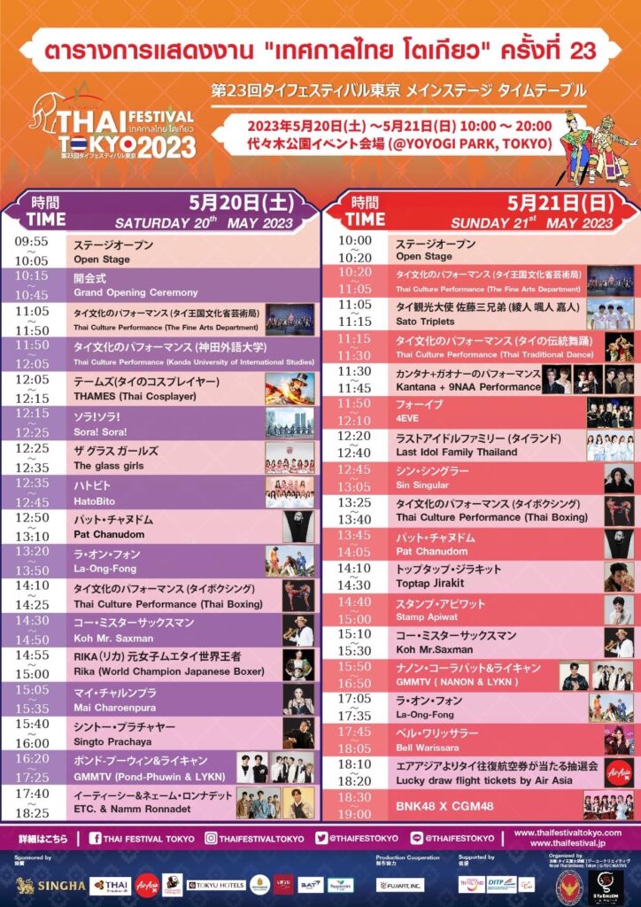 เตรียมนับถอยหลังสู่งานเทศกาลไทยที่ยิ่งใหญ่ที่สุดในประเทศญี่ปุ่นครั้งที่ 23 ในวันเสาร์อาทิตย์ที่ 20-21 พฤษภาคมนี้ ณ สวนสาธารณะ โยโยงิ ตั้งแต่เวลา 10.00 – 20.00 น. สามารถติดตามรายละเอียดและกิจกรรมต่างๆได้ที่ Line: @THAIFESTOKYO FB / IG : THAI FESTIVAL TOKYO / TWITTER : @THAIFESTOKYO หรือติดตามรายละเอียดได้ที่ www.Gyucreative.com/thaifestivaltokyo และ www.thaifestival.jp