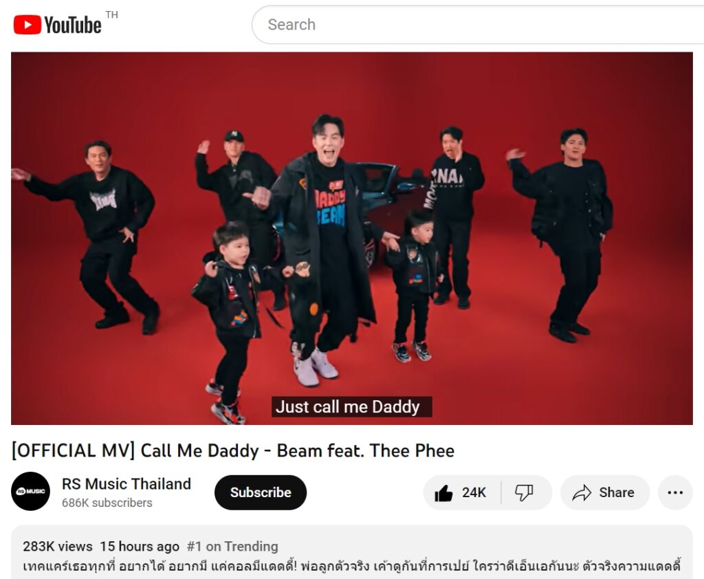 เรียกว่าจัดเต็มได้แบบน่ารักน่าหยิก จนติดเทรนด์มาแรงอันดับ 1 ในยูทูป สำหรับมิวสิควิดีโอสุดคิ้วท์ “Call Me Daddy” จากโปรเจกต์RS Homecoming ของ RS MUSIC ที่ชวน พ่อพ่อบีม หรือ บีม กวี ตันจรารักษ์ ให้กลับมาเซอร์ไพรส์แฟน ๆ พร้อมควงแขนสองแฝดสุดแสบ พี่ธีร์ ธีร์ทองธรรม น้องพีร์ พีร์ทองธรรม ตันจรารักษ์ รวมความสนุกคูณสามเพื่อส่งความสดใสในแนวเพลง Electronic Pop ซึ่งได้โปรดิวเซอร์มือทอง เอ้ BOTCASH มาดีไซน์บีทสุดมันส์ ชวนให้ขยับร่างกายกับเนื้อหาเพลงของตัวพ่อสายเปย์ แค่ Call Me Daddy ก็พร้อมทุ่มทั้งหัวใจ เปย์ไวแบบ Full Option! แถมมาพร้อมกับท่าเต้นสุดมันส์มาให้แฟน ๆ ได้เต้นตามกันอีกด้วย