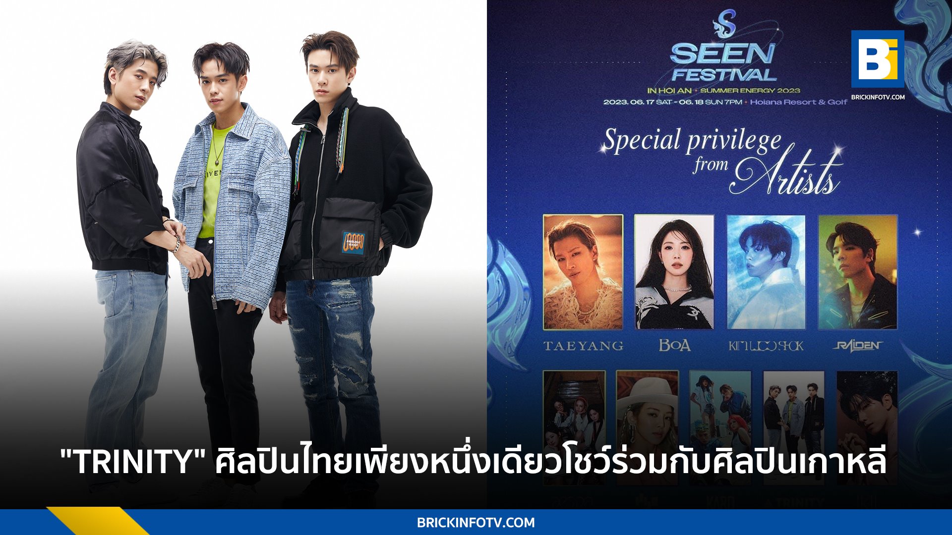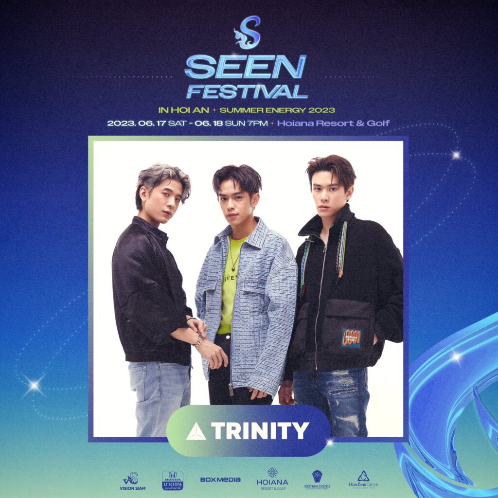 สิ้นสุดการรอคอยของแฟน ๆ ต่างชาติ เมื่อ 3 หนุ่ม วง “TRINITY (ทรินิตี้)” อย่าง “เติร์ด ลภัส งามเชวง, ปอร์เช่ ศิวกร อดุลสุทธิกุล และ แจ๊คกี้ จักริน กังวานเกียรติชัย” ศิลปินภายใต้สังกัด 4NOLOGUE พร้อมไปอวดความสามารถให้ได้เห็นถึงศักยภาพศิลปินไทยในเวทีต่างประเทศ โดยวง TRINITY (ทรินิตี้) เตรียมระเบิดความมันส์ให้ได้สนุกกันอย่างเต็มอิ่ม ในงาน “Seen Festival” วันที่ 17 และ 18 มิถุนายนนี้ ณ Hoiana Resort & Golf รีสอร์ตสุดหรูที่มีชื่อเสียงของประเทศเวียดนาม