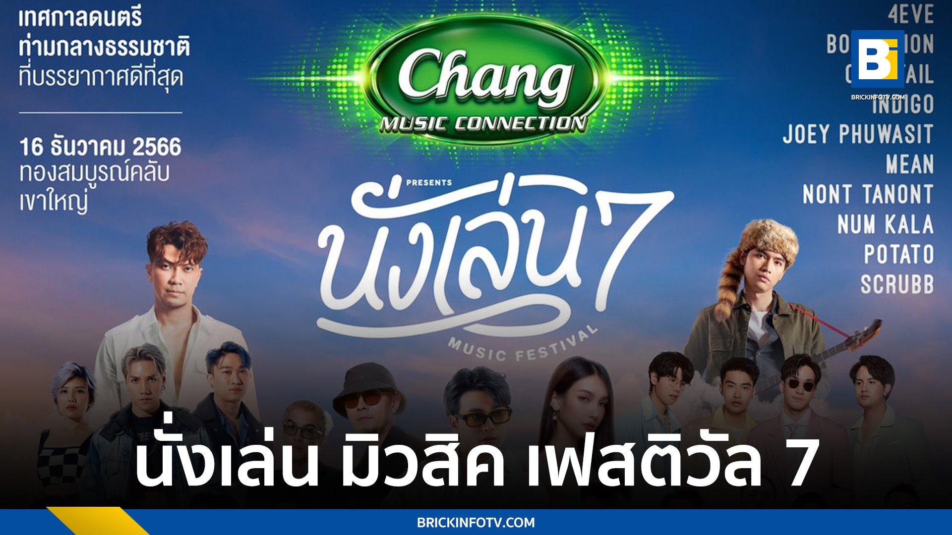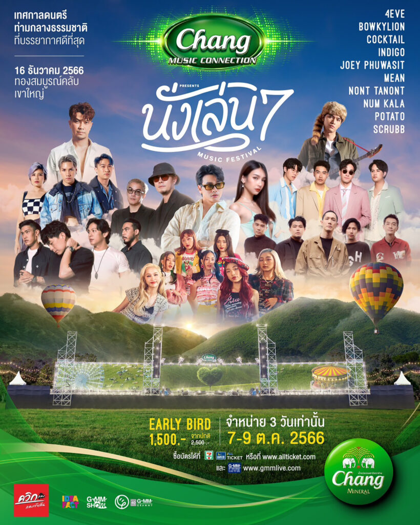 ‘ช้าง มิวสิค คอนเนคชั่น พรีเซนต์ นั่งเล่น มิวสิค เฟสติวัล 7’ จะจัดขึ้นในวันเสาร์ที่ 16 ธันวาคม 2566 ณ ทองสมบูรณ์คลับ จ.นครราชสีมา โดยจะเปิดจำหน่ายบัตร EARLY BIRD ถูกที่สุด ราคา 1,500 บาท (ราคาปกติ 2,500 บาท) ในวันที่ 7-9 ตุลาคมนี้ ซื้อบัตรได้ที่เคาน์เตอร์เซอร์วิส ออลล์ ทิคเก็ต ในร้านเซเว่นอีเลฟเว่น ทั่วประเทศ หรือ www.allticket.com และ www.gmmlive.com
