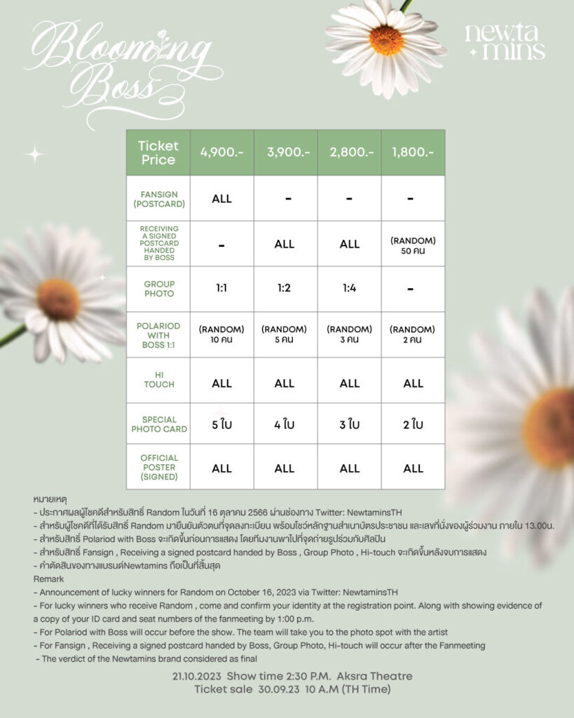 พระเอกซีรีส์วายที่ทั้งหล่อและมากความสามารถ “บอส ชัยกมล เสริมส่งวิทยะ” เตรียมชวนเหล่าแฟนคลับชาวชอว์ตี้บอส (ShawtyBoss) ไปร่วมฟิน สนุก และเก็บความประทับใจร่วมกันในงาน “Blooming Boss Fanmeeting Presented by Newtamins” งานแฟนมีตติ้งเดี่ยวและเปิดตัวการเป็นพรีเซนเตอร์คนแรกอย่างเป็นทางการให้กับผลิตภัณฑ์วิตามินสำหรับผิวระดับพรีเมี่ยม “Newtamins” โดยงานนี้จะจัดขึ้นในวันเสาร์ที่ 21 ตุลาคม 2566 ณ โรงละครอักษรา คิง พาวเวอร์ (Aksra theatre king power) เริ่มจำหน่ายบัตรวันเสาร์ที่ 30 กันยายน นี้ ผ่านทาง www.eventpop.me ราคาบัตร 4,900 บาท / 3,900 บาท / 2,800 บาท และ 1,800 บาท