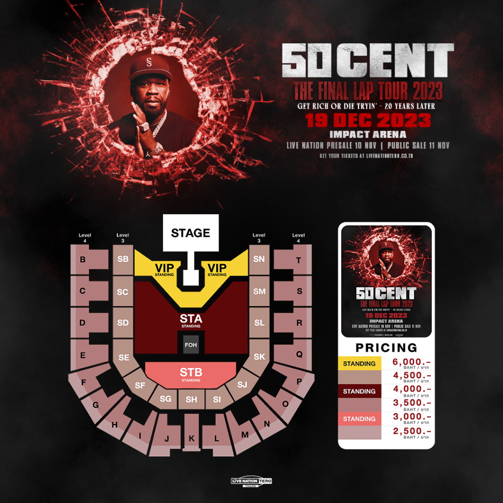 “50 Cent” (ฟิฟตี้ เซ็นต์) แรปเปอร์รุ่นใหญ่ เจ้าของรางวัล Grammy® ฉลองครบรอบ 20 ปีของเดบิวต์อัลบั้ม “Get Rich or Die Tryin’” (เก็ท ริช ออร์ ดาย ทรายอิน) กับคอนเสิร์ตใหญ่ “The Final Lap Tour” (เดอะ ไฟนอล แลป ทัวร์) โดยมีกาหนดการแสดง ที่กรุงเทพฯ วันอังคารที่ 19 ธันวาคมนี้ ที่อิมแพ็ค อารีน่า เมืองทองธานี ส าหรับคอนเสิร์ตครั้งนี้ การันตีว่าแฟน ๆ จะได้ฟังเพลงฮิต ติดหู และเพลงดังที่ยังอยู่ในใจแฟน ๆ ที่ 50 Cent ไม่เคยแสดงที่ไหนมาเป็นเวลากว่าสิบปี และถือเป็นการกลับมาพบเจอแฟนๆ ชาวไทยในรอบ 17 ปีของแรปเปอร์ระดับตานานคนนี้ที่มาเล่นที่ไทยเป็นประเทศเดียวในเอเชียอีกด้วยอัลบั้มชุดแรก “Get Rich or Die Tryin’” ท าให้ 50 Cent เป็นที่รู้จักและได้รับการยอมรับจากแฟน ๆ และนักวิจารณ์เพลงทั่วโลก ด้วยยอดขายกว่า 30 ล้านก็อปปี้ ขึ้นแท่นเป็นหนึ่งในอัลบั้มที่ยอดขายเติบโตไวที่สุดอัลบั้มหนึ่ง ส่งผลให้เขากลายเป็นหนึ่งใน ศิลปินผู้ทรงอิทธิพลในวงการเพลงฮิปฮอป