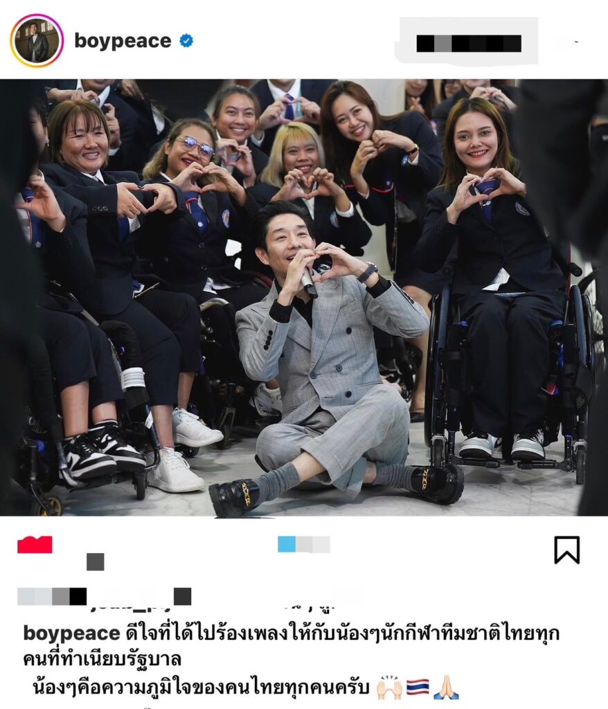 ยิ้มไม่หุบดีใจเป็นที่สุดที่ได้มีโอกาสมอบเสียงเพลงเพื่อเป็นหนึ่งพลังใจให้กับเหล่านักกีฬาทีมชาติไทย สำหรับบอย พีซเมคเกอร์ ที่ล่าสุดเจ้าตัวได้โพสต์ภาพร่วมกับเหล่านักกีฬา พร้อมกับแคปชั่นสุดปลื้มใจที่ได้เป็นพลังใจเล็กๆที่มอบให้แก่เหล่านักกีฬาที่ไปสร้างชื่อให้ประเทศไทยของเรา โดยบอยได้เผยว่า