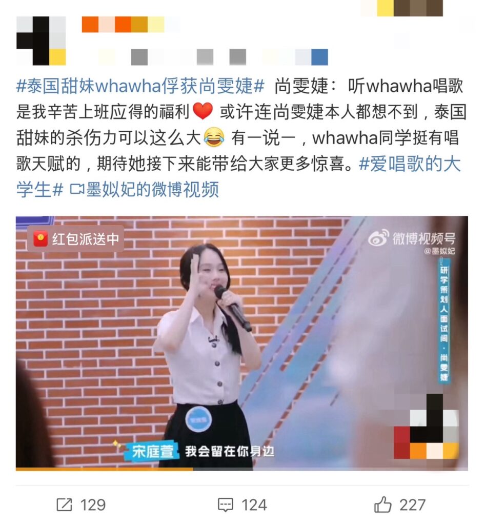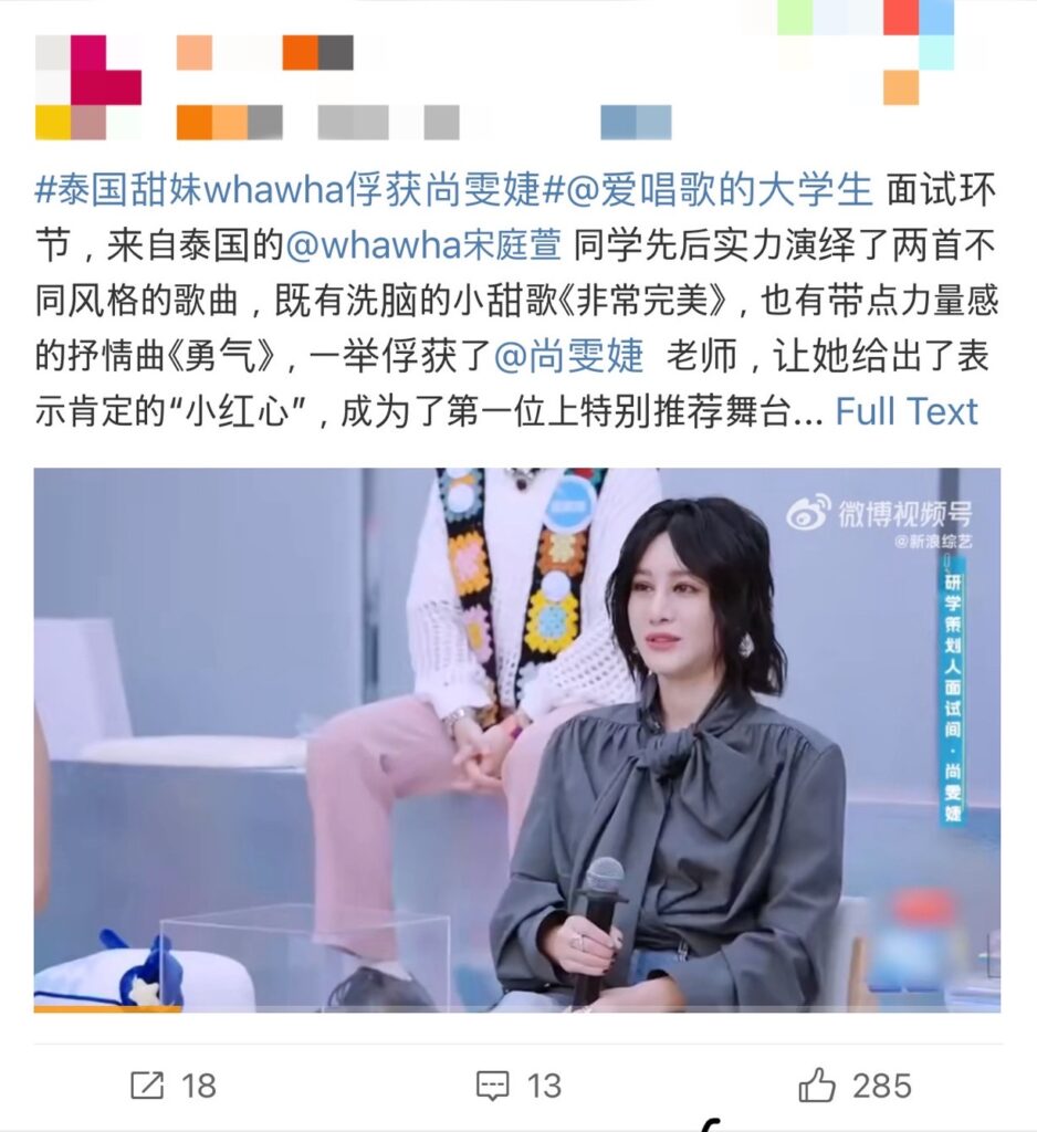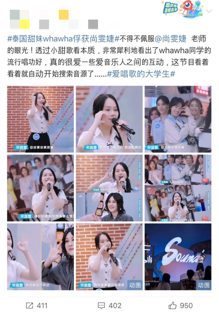 โดยหว่าหวา แสดงศักยภาพในการร้อง พร้อมมอบเสียงใส ๆ จนมัดใจ Mentor เหล่าซือ ช่างเหวินเจี๋ย (尚雯婕 Shang Wenjie) พร้อมได้รับคำชมและฟีดแบ็คที่ดี จนสร้างปรากณการณ์แฮชแท็ก #สาวหวานคนไทยหว่าหวามัดใจซ่างเหวินเจี๋ย ในสื่อโซเชียลอย่างมาก ทั้งยังได้รับคำตอบรับที่ดีจนมียอดการเข้าชมรายการอีพีแรกมากกว่า 25 ล้านวิวไปอีกด้วย