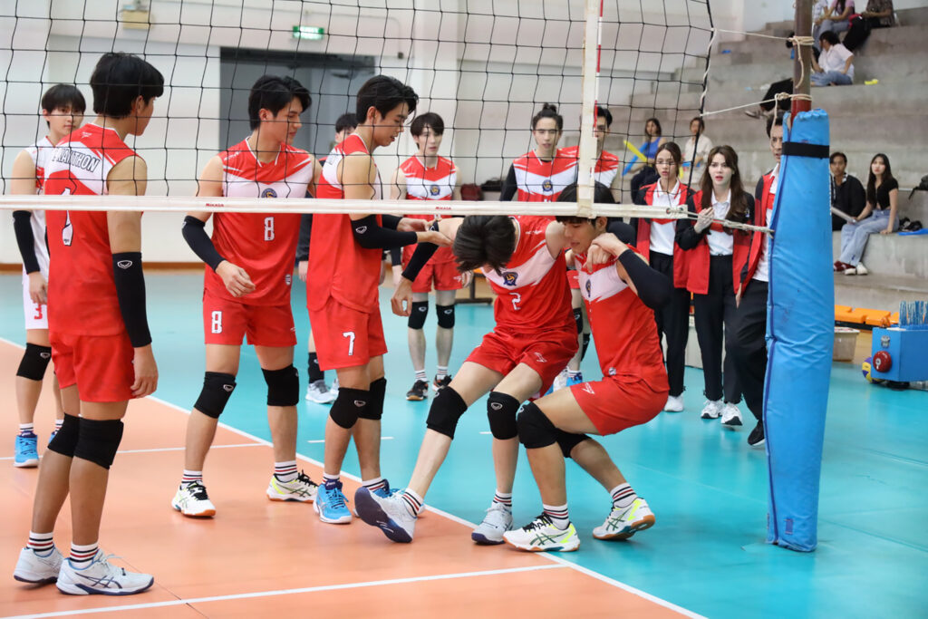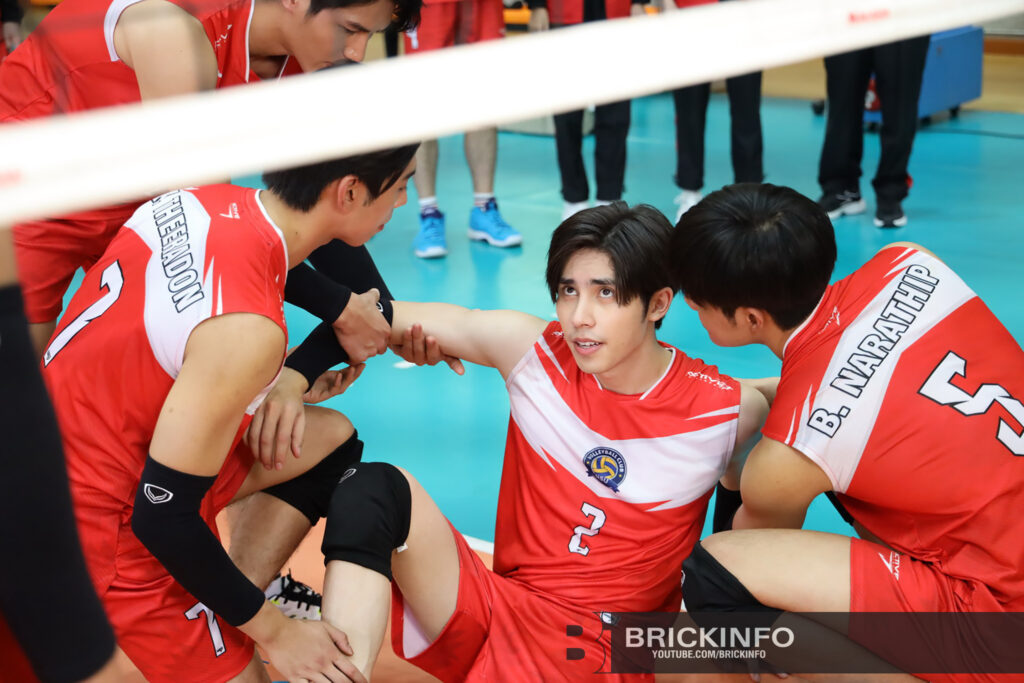 เราขอเอิ้นฉากเบื้องหลังการแข่งขันวอลเล่ย์บอลกันก่อน นอกจากจะมีนักแสดงเข้าฉากครบทีมแล้ว ยังมีเหล่ากองเชียร์มาร่วมเฟรมด้วย ทำเอาบรรยากาศในการถ่ายทำคึกคักกันทีเดียว สองผู้กำกับฯ ก็ขอถ่ายทำฉากแข่งขันวอลเล่ย์บอลก่อน โดยอินเสิร์ทคัทที่ทั้งสองทีมกำลังแข่งขันกันอย่างเข้มข้น พอมาถึงคัทไฮไลท์ที่ สไปรท์ ต้องทำ เฟิร์ส เพื่อนร่วมทีมบาดเจ็บ อันนี้ผู้กำกับฯ ต้องถ่ายกันหลายครั้ง หลายมุม ทำเอา 2 นักแสดง ทั้งหนุ่มเฟรม และหนุ่มไรอัน ต้องกระโดดตบลูกนับไม่ถ้วน แถมยังต้องถ่ายสีหน้าที่ต้องใส่อารมณ์แบบสโลโมชั่นให้เห็นภาพกันชัดๆอีก ขอบอกว่าฉากนี้นักแสดงทั้งคู่ต้องกระโดดและล้มกันแบบเห็นแล้วเหนื่อย และเจ็บแทนหนุ่มไรอัน เลยล่ะ!!!