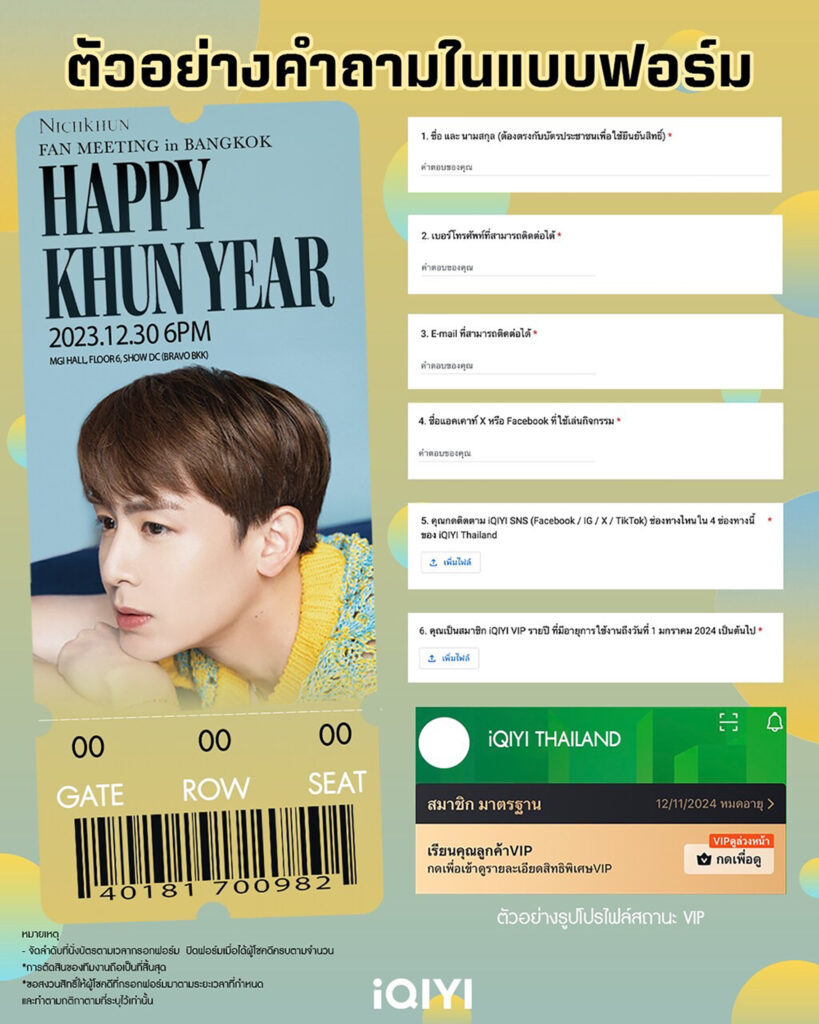 iQIYI (อ้ายฉีอี้) ขอส่งต่อความสุข มอบของขวัญส่งท้ายปีให้แฟนๆ สมาชิก iQIYI VIP กับกิจกรรมการแจกบัตรงานเข้าร่วมงาน FAN MEETING เดี่ยวของนักร้องและนักแสดงชื่อดัง หนึ่งในสมาชิกวง 2PM “คุณ นิชคุณ หรเวชกุล” ที่พร้อมจะมาแจกความอบอุ่น ขนโชว์แบบจัดเต็ม เฉลิมฉลองส่งท้ายปี 2566 กับงาน “NICHKHUN FAN MEETING IN BANGKOK : HAPPY KHUN YEAR” ที่งานนี้อ้ายขอแจกบัตรเข้าร่วมงานจำนวน 190 ใบ! โดยงานจะจัดขึ้นในวันเสาร์ที่ 30 ธันวาคม 2566 ณ MGI Hall ชั้น 6 ศูนย์การค้า Show DC สำหรับกติการ่วมสนุกมีดังต่อไปนี้