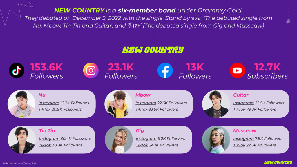 และนี่คือมัดรวมผลประกอบการ ครบ 1 ปี ของวงน้องใหม่ในแนว “COUNTRY POP” วง “NEW COUNTRY” เราจะมาตามดูกันว่าในปี 2567 นี้ น้องๆทั้ง 6 จะมีอะไรมาให้เราได้เซอร์ไพรส์กันอีก แต่ที่แน่ๆวงในรายงานมาว่า สมาชิก 3 คนในวง จะได้มีโอกาสโชว์สกิลด้านการแสดงในปีนี้แน่นอน หรือไม่แน่อาจจะมีสมาชิกใหม่ๆมาเติมวง NEW COUNTRY ให้มีความหลากหลายมากขึ้นก็เป็นไปได้