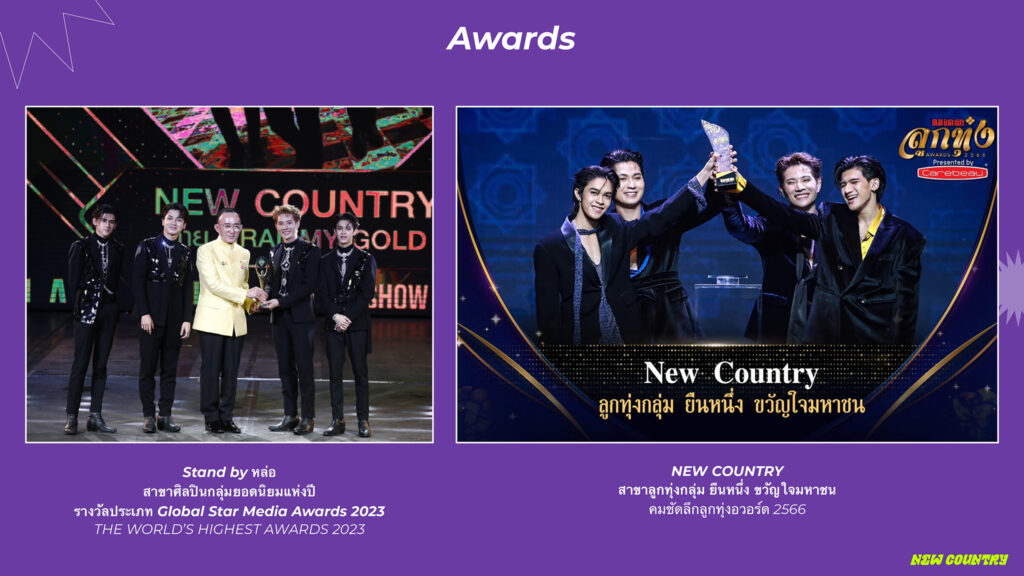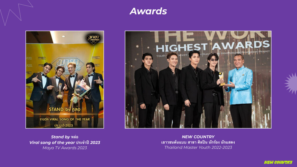 ในส่วนของรางวัลนั้นการันตีด้วยรางวัลหลากหลายสาขา ไม่ว่าจะเป็น รางวัลคมชัดลึกลูกทุ่ง อวอร์ด 2566 สาขา ลูกทุ่งกลุ่ม ยืนหนึ่ง ขวัญใจ มหาชน, รางวัลเกียรติยศ MAYA TV AWARDS 2023 รางวัล VIRAL SONG OF THE YEAR ประจำปี 2023, รางวัลเกียรติคุณ Thailand Master Youth 2022-2023 “เยาวชนต้นแบบ สาขา ศิลปิน นักร้อง นักแสดง”, รางวัล THE WORLD’S HIGHEST AWARDS 2023 รางวัลในประเภท Global Star Media Awards 2023 สาขา ศิลปินกลุ่มยอดนิยมแห่งปี เพลง “STAND BY หล่อ” และได้เข้าชิงรางวัล NINE ENT.AWARD และ TIKTOK AWARD ปี 2023 นอกจากนี้ TIKTOK ยังจัดอันดับให้เป็น ศิลปิน Most Viewed Artist Thailand 2023 ·อันดับที่ 8 อีกด้วย อีกด้วย