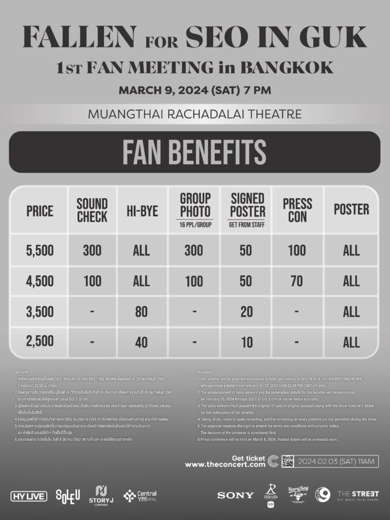 โดยในงาน “FALLEN FOR SEO IN GUK 1st FAN MEETING in BANGKOK” แฟนๆ จะได้รับชมโชว์สุดพิเศษที่ซออินกุกได้ซุ่มซ้อมเป็นอย่างดี จัดเต็มความฟินแบบจุใจเพื่อแฟนๆ ชาวไทยโดยเฉพาะ งานนี้จะฟินและอบอุ่นขนาดไหน เตรียมกดบัตรพร้อมกันวันเสาร์ที่ 3 กุมภาพันธ์ 2567 เวลา 11:00 น. นี้ ราคาบัตร 5,500 / 4,500 / 3,500 / 2,500 บาท (ราคาไม่รวมค่าธรรมเนียมการออกบัตรและค่าบัตรพลาสติก) ซื้อบัตรได้ที่ www.theconcert.com หรือผ่านทางแอปพลิเคชัน The Concert เท่านั้น