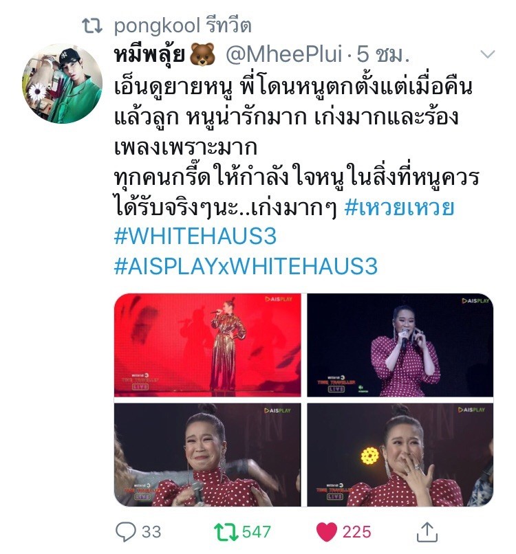 เจ๋งจริง!! อะไรจริง!! ก็คงต้องยกให้น้องใหม่คนนี้… “เหวยเหวย ฮัน” สาวหมวยอินเตอร์ที่พกฝีมือการร้องระดับมาสเตอร์พีซ มาสาดอารมณ์สะกดแฟนๆด้วยบทเพลง เผ็ช เผ็ช “ไม่มีเธอไม่ตาย” โชว์พลังเสียงแบบที่ใครฟังก็ต้องกรี๊ดตาม สะกดคนดูกลางเวที WHITEHAUS #3 : TIME TRAVELLER ซะอยู่หมัด ส่งให้แฟนๆปรบมือให้กำลังใจกับแบบล้นๆ จนสาวเหวยเก็บอาการดีใจไว้ไม่อยู่ ปล่อยน้ำตาแห่งความปลื้มปริ่มออกมากลางเวที ขึ้นแท่นศิลปินน้องใหม่ในดวงใจทันที การันตีจากกระแสพูดถึงบนโลกออนไลน์ที่ชื่นชมกันไม่ขาดปาก แถมยังแรงแซงโค้งติดเทรนด์ทวิตเตอร์ไปอี๊กกกกกกก งานนี้แฟนๆโดนชีตกแบบไม่ทันตั้งตัว เอาไปอยู่ในอ้อมใจไปเป็นที่เรียบร้อยแล้ว!
