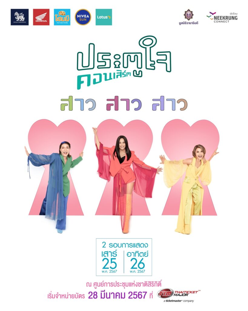 เตรียมตัวให้ดี คอนเสิร์ตนี้จุใจ เซอร์ไพรส์เน้นๆ จัดเต็มกว่าครั้งไหนๆ เพราะทั้ง 3 สาวเทคิวซุ่มซ้อมหนัก ทั้งร้อง ทั้งเต้น โชว์เดี่ยว โชว์กลุ่ม โชว์พิเศษก็เกินร้อยแน่ แถมศิลปินรับเชิญก็เริ่ดสุด…เท่สุด…ฮาสุด…ใสสุด… และคาดไม่ถึงมากที่สุด จะเป็นใคร สนุกแค่ไหน? มาเปิดประตูของความคิดถึงไปด้วยกัน ใน“สาว สาว สาว ประตูใจคอนเสิร์ต” กับ 2 รอบการแสดง วันเสาร์ที่ 25 – อาทิตย์ที่ 26 พฤษภาคม 2567 นี้ ณ ศูนย์การประชุมแห่งชาติสิริกิติ์ เริ่มจำหน่ายบัตรวันที่ 28 มีนาคม 2567 (10.00 น. เป็นต้นไป) ที่ไทยทิคเก็ตเมเจอร์ ทุกสาขา และ www.thaiticketmajor.com