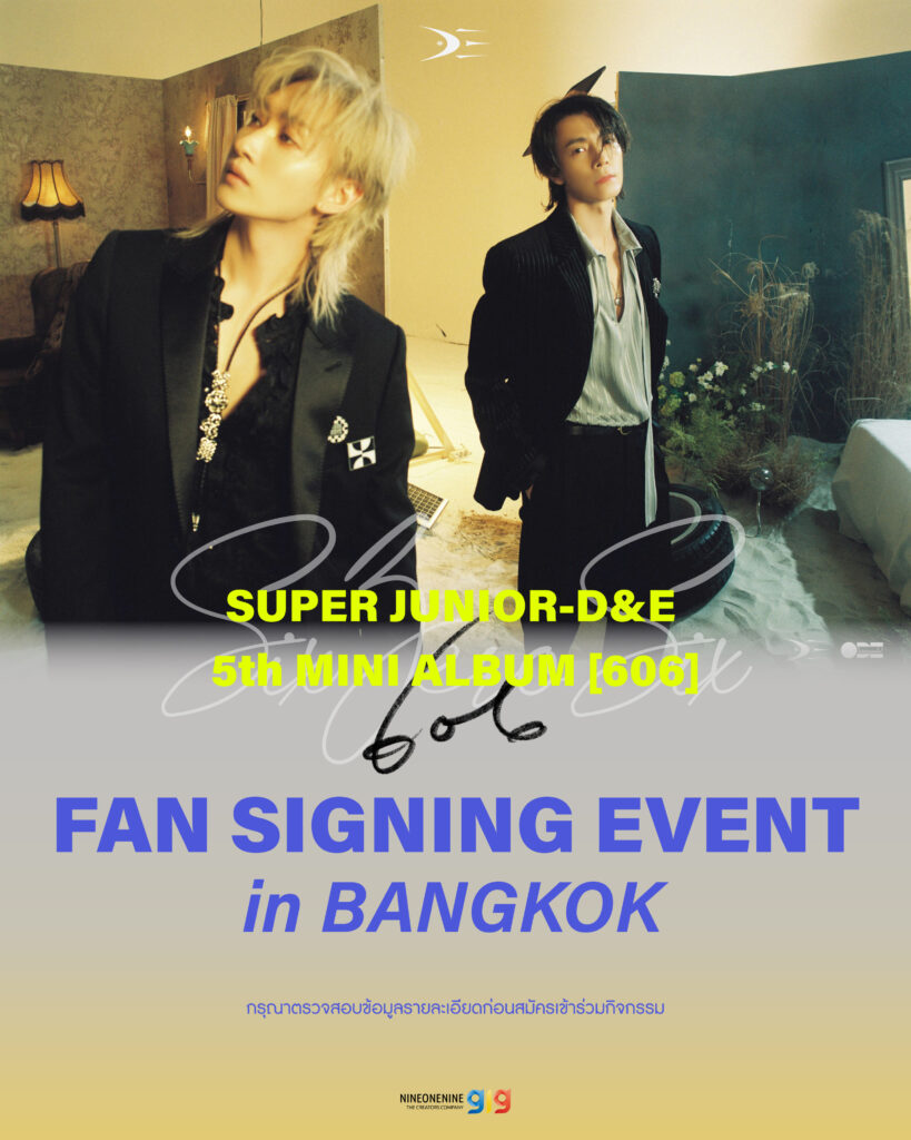 ปักหมุด! ลงคิวเตรียมตัวต้อนรับ “ทงเฮ, อึนฮยอก SUPER JUNIOR” ที่กำลังจะเดินทางมาพบชาว & ANNIE (ANNIE: ชื่อแฟนคลับ) ที่ประเทศไทยแบบใกล้ชิด กับ 2 งานสุดฟิน งานแรก 26 เมษายนนี้ SUPER JUNIOR-D&E 5th MINI ALBUM(606) FAN SIGNING EVENT in BANGKOK ที่จัดขึ้นให้แฟนๆ ผู้โชคดีที่ซื้ออัลบั้ม SUPER JUNIOR-D&E 5th MINI ALBUM(606) จำนวน 300 คน ได้รับลายเซ็นกับมือได้จ้องตาสองหนุ่มในระยะประชิด ระยะเวลาการร่วมกิจกรรมตั้งแต่วันนี้ 8 เมษายนนี้ ช่องทางจำหน่ายอัลบั้ม www.nineonenine919event.com