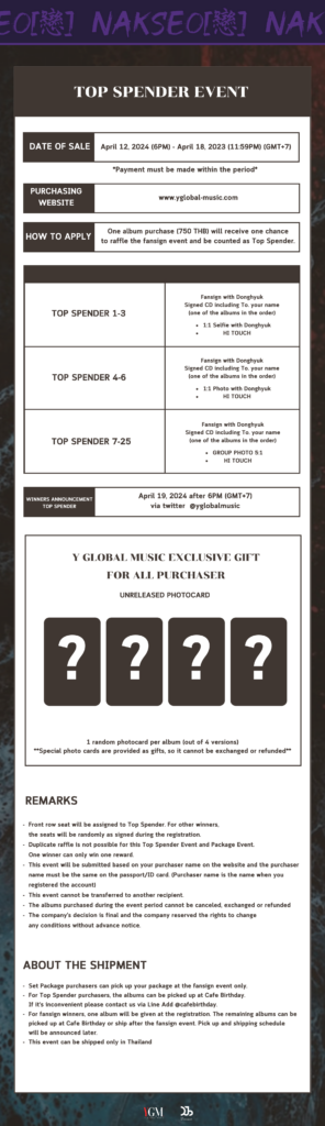 สำหรับกิจกรรมแฟนไซน์สุดพิเศษในครั้งนี้ นอกจากไอคอนิคไทยจะได้พบเจอกับหนุ่ม ดงฮยอก อย่างใกล้ชิดแล้ว ยังมีกิจกรรมสุดพิเศษอีกมากมายให้ทุกคนได้เพิ่มความเอ็กคลูซีฟกันอีกด้วย ไม่ว่าจะเป็น ถ่ายเซลล์ฟี่ 1:1 ถ่ายรูปคู่ ไซน์โพลารอยด์ ถ่ายรูปหมู่ หรือไฮทัช (HI TOUCH) ใครที่สนใจเข้าร่วมงานนี้เพียงซื้อ NAKSEO[戀] 1st Solo Album ตั้งแต่วันนี้ ถึง 18 เมษายน 2567 เวลา 23.59 น. เท่านั้น โดยสามารถสั่งซื้อ และติดตามรายละเอียดเพิ่มเติมได้ที่ www.yglobal-music.com