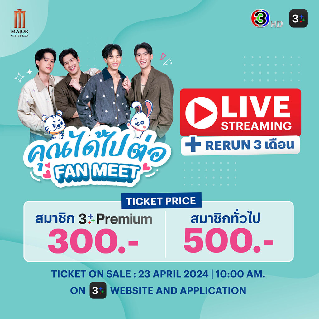 ใครที่มีบัตรกำไว้ให้แน่น ๆ เตรียมไปดูโชว์เด็ด ๆ ของทั้ง 4 หนุ่มได้ในงาน “คุณได้ไปต่อ FAN MEET” วันอาทิตย์ที่ 28 เมษายน 2567 เวลา 16.30 น. สำหรับใครที่ไม่มีบัตรสามารถกดซื้อบัตรเข้าชม “คุณได้ไปต่อ FANMEET LIVE STREAMING TICKET” ได้ในราคา 300 บาท (สำหรับสมาชิก 3Plus Premium) และราคา 500 บาท (สำหรับสมาชิกทั่วไป) *บัตรทั้งสองราคา สามารถรับชม LIVE STREAMING และ ดูย้อนหลังได้ 3 เดือน