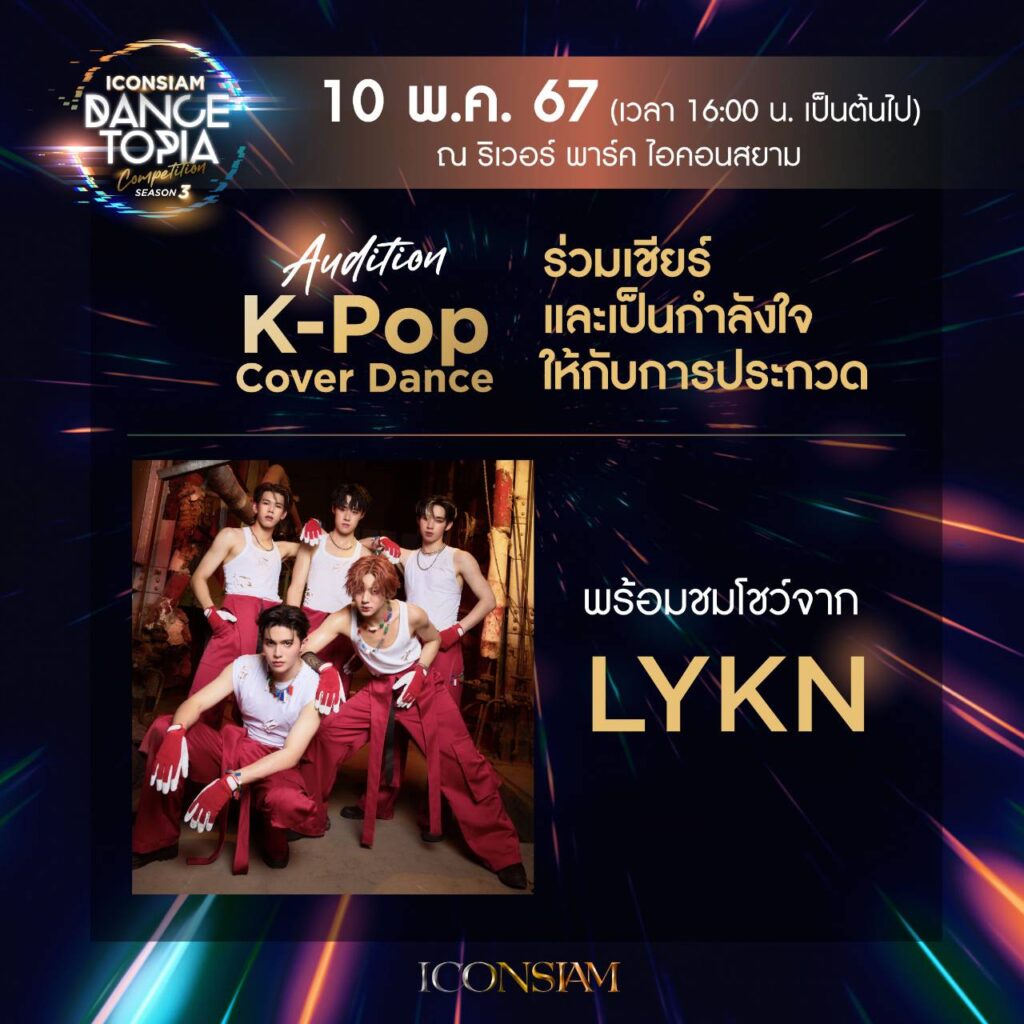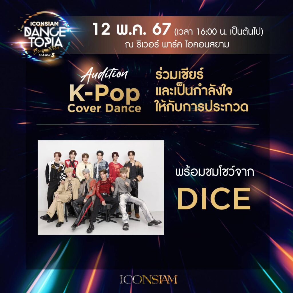 ไอคอนสยาม ร่วมกับ การกีฬาแห่งประเทศไทย, ศูนย์วัฒนธรรมเกาหลีประจำประเทศไทย (KCC), สมาคมกีฬาเชียร์แห่งประเทศไทย, THE INNER STUDIO, B HOUSE STUDIO, THE KNIVERSE x GRAVITY MOTION, The Makers Dance Studio และ Lotus’s Privé จัดโครงการประกวดเฟ้นหาสุดยอดนักเต้น บนเวทีการแข่งขัน “ICONSIAM DANCETOPIA COMPETITION SEASON 3” ภายใต้คอนเซ็ปต์ DANCE TO THE WORLD เวทีที่นักเต้นจะได้โอกาสก้าวสู่ระดับสากล เปิดรับสมัครนักเต้น K-Pop Cover Dance เพื่อชิงรางวัลรวมมูลค่ากว่า 300,000 บาท ร่วมลุ้นเป็นหนึ่งในนักเต้นที่จะมีโอกาสได้ไป Dance Training Camp ที่ประเทศเกาหลีใต้ พร้อมเปิดเวทีค้นหาสุดยอดนักเต้น T-Pop Battle และ The Best Random Dance ที่ยิ่งใหญ่ที่สุดในประเทศไทย ชิงรางวัลรวมมูลค่ากว่า 30,000 บาท พร้อมกิจกรรมอีกมากมาย โดยรวบรวมสุดยอดนักเต้นระดับประเทศ ระดับแชมป์ หลากหลายแขนง ทั้ง K-Pop, T-Pop, J-Pop, HipHop, Cheerleading มาร่วมแสดงความสามารถให้ทุกคนได้ชมลีลา สเต็ปแดนซ์อย่างใกล้ชิด ในบรรยากาศริมแม่น้ำเจ้าพระยา ระหว่างวันที่ 9-12 และ 17-19 พฤษภาคม 2567 ณ ริเวอร์ พาร์ค ไอคอนสยาม
